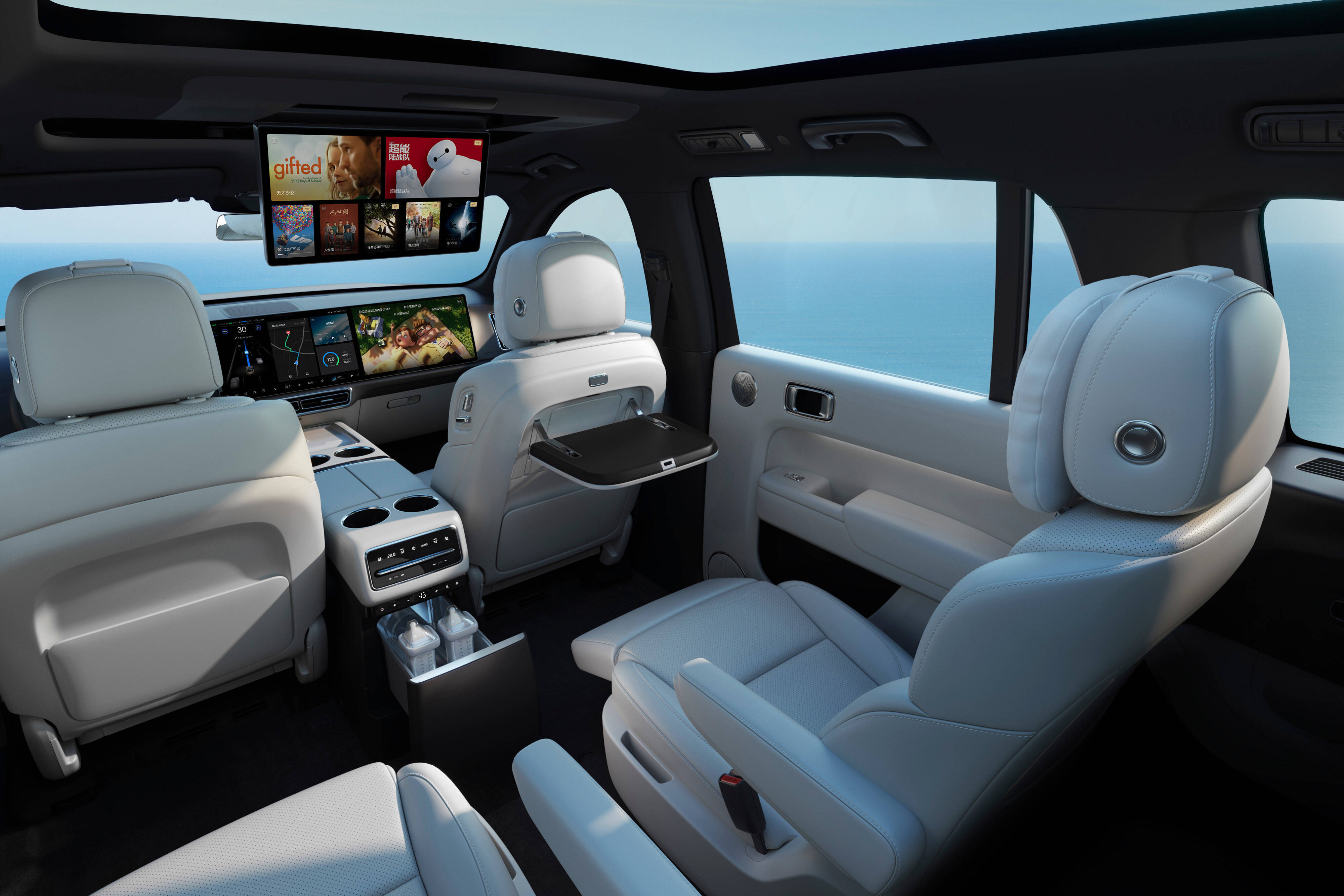 • 办公休闲,随时切换:第二排「皇后座椅」带电动腿托与小桌板,开启「休憩模式」可临时办公;遮阳帘与独立空调营造私密空间,搭配车载冰箱里的冰咖啡,小型商务洽谈轻松搞定。