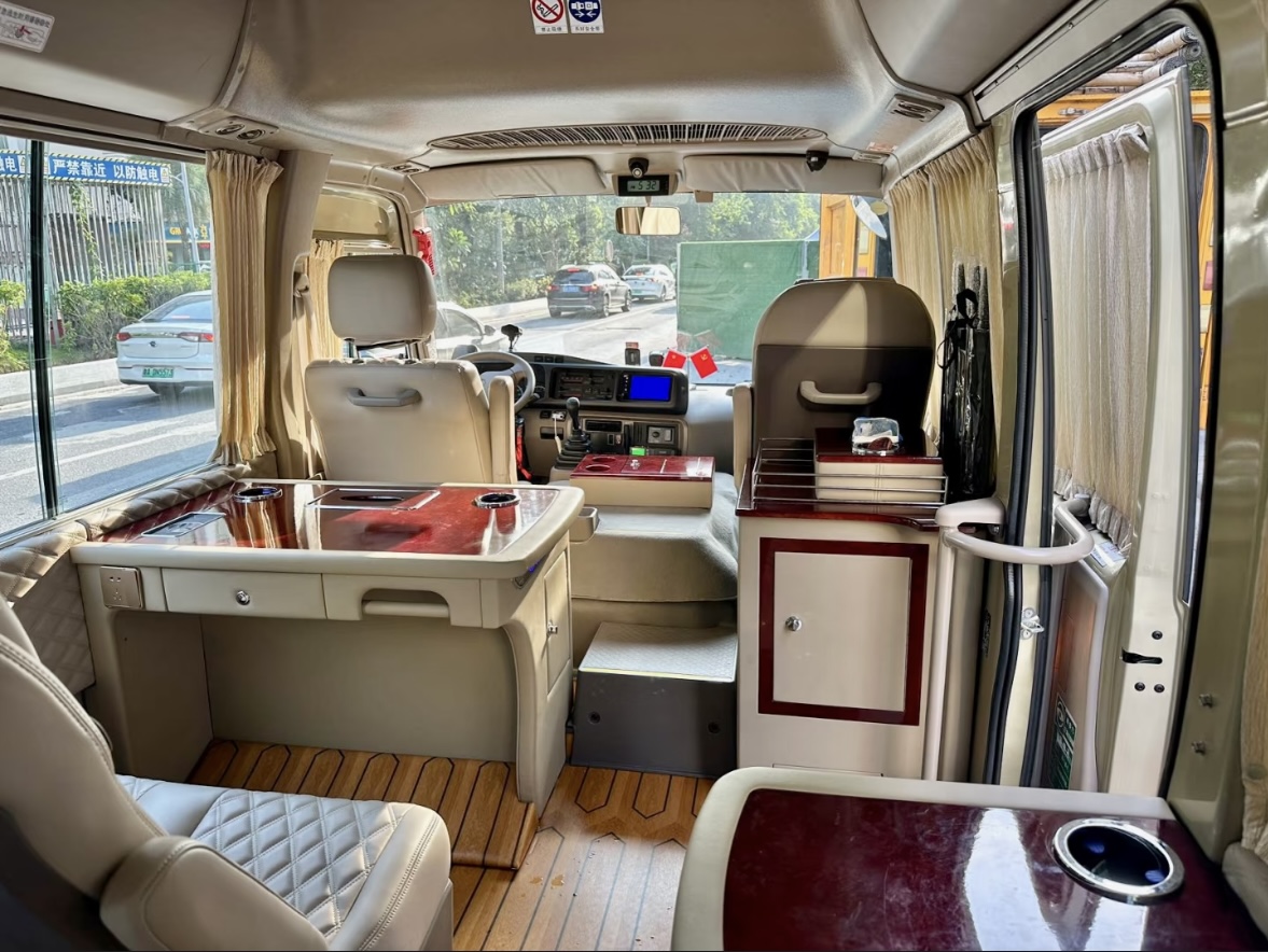 2.核心配置:顶置变频空调(分区控温 + 空气净化),人体工学座椅(带充电口),配安全系统(ABS/ESP)与导游设备;