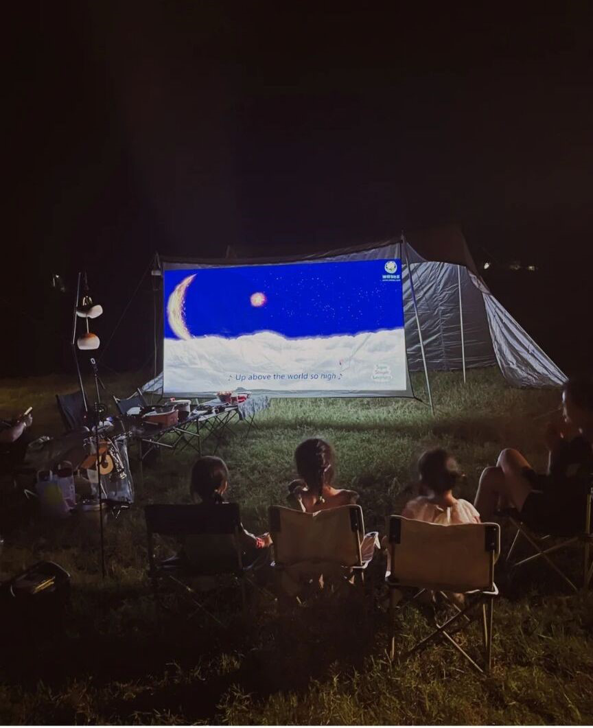 用完餐后看着灰蓝的夜空,缀满了小星星,看着远方的雪山,听着柔和的歌谣,观看一次露天小电影氛围感拉满。放下幕布、摆好投影,大荧幕亮起就是一个露天的电影院,以山野为背景的360°沉浸式观影,带来直面自然的视觉盛宴,奇妙的晚上由此开启。看完电影躺在星空下入眠,抬起头便是满天繁星,放松又享受。