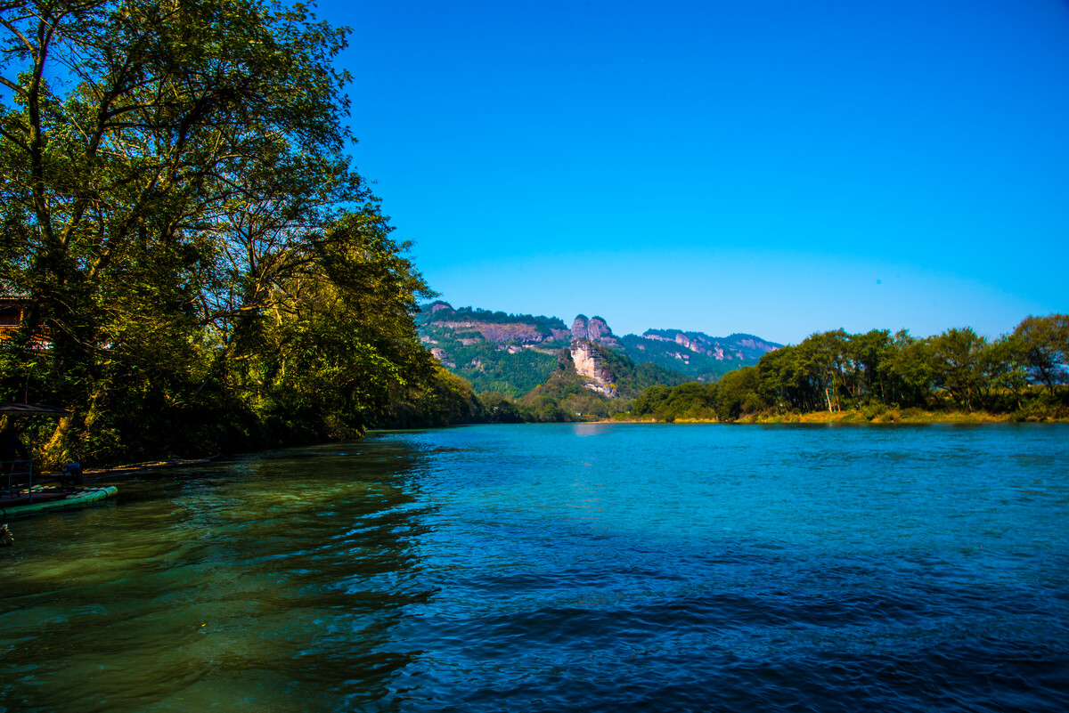 夫夷江漂流。江水清澈见底,平缓如镜,水面宽约100米,窄处70多米。两岸的奇峰异石在碧水蓝天下倒映于水面,船帆点点,竹笛声声,如诗如画。最重要的是欣赏将军石只能坐竹筏顺江漂流,才能深切感受将军石的神韵。