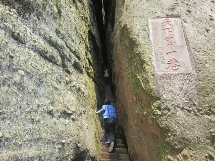 接着游览【天一巷景区】,被称为崀山第一绝的天下第一巷,全长238.8米,两侧石壁高80—120余米,最宽处0.8米,最窄处0.33米,可谓世界一线天绝景。人行于弯曲的巷道中,如置身地底,战兢不已;两旁绝壁对峙,笔直如刀劈斧削,抬头唯见一线青天;又恍若时间隧道里的过客,体验着险与美的魅力。当过客从幽暗狭窄的石巷中走出,在尽情欢呼之余,不禁生恍若隔世之感。每当阳光映照,巷壁熠熠生辉,奇妙无比。(活动时间:约3小时)