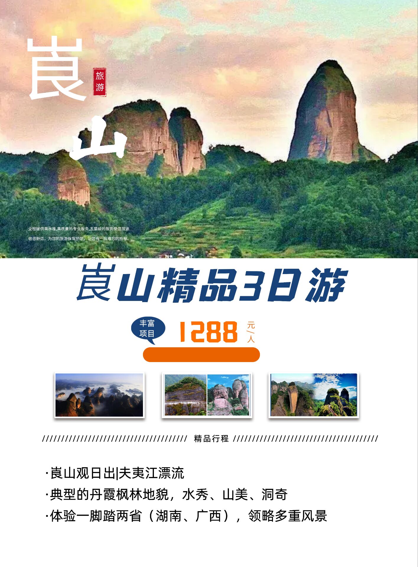活动景点【扶夷江】景区,扶夷江是崀山风景名胜区的精华景区之一,发源于广西猫儿山,是崀山的母亲河,为洞庭湖的资水源头。其水域贯穿崀山风景区,游山、玩水均具有得天独厚的条件。在此体验【夫夷江漂流】,夫夷江漂流可让你纵览江上美景,竹筏漂流,顺流而下,领略沿途风光。