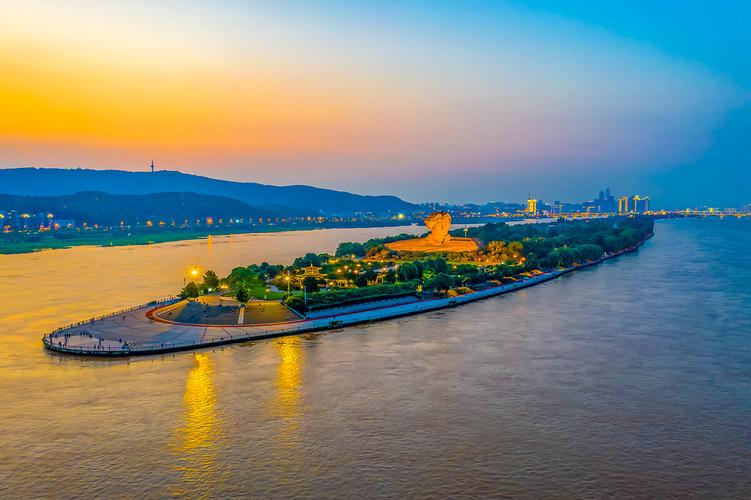 橘子洲四面环水。洲上林木众多、远看如一艘墨绿色的巨舰、逆水扬波护卫着长沙古城。 洲上盛产美橘。故名橘洲、自古以秀丽风光悠久历史著称。是宋代著名的“潇湘八景”之“江天暮雪”所在。橘洲“五六月间无暑气”、是一处消夏胜地。
