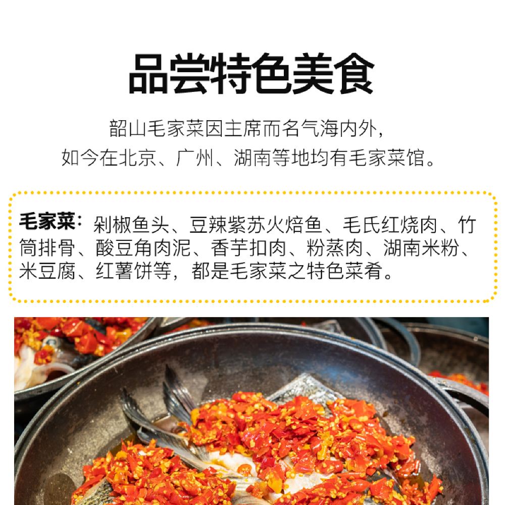 韶山毛家菜因主席而名气海内外,如今在北京、广州、湖南等地均有毛家菜馆毛家菜:剁椒鱼头、豆辣紫苏火焙鱼、毛氏红烧肉、竹筒排骨、酸豆角肉泥、香芋扣肉、粉蒸肉、湖南米粉、米豆腐、红薯饼等,都是毛家菜之特色菜肴。