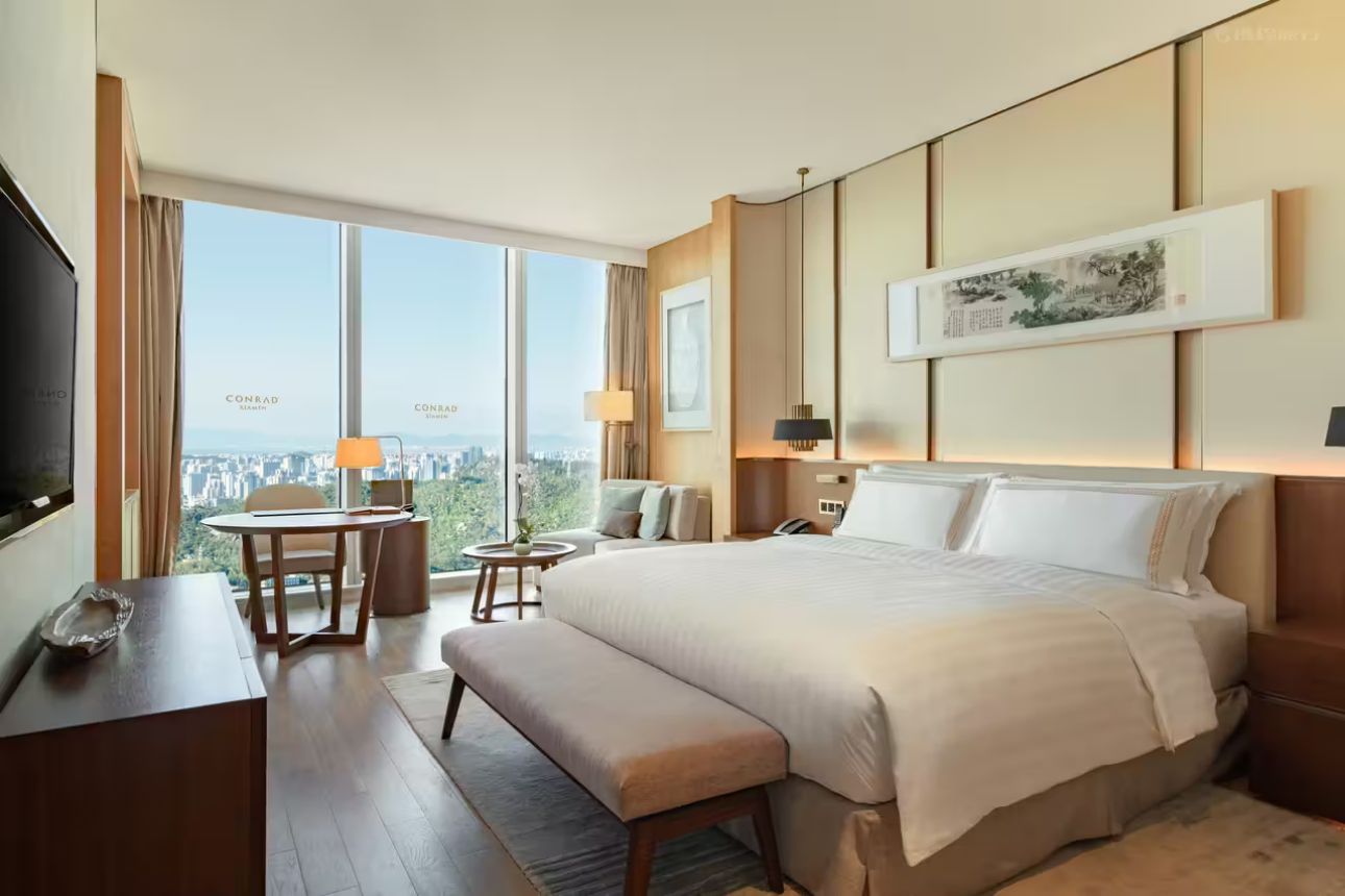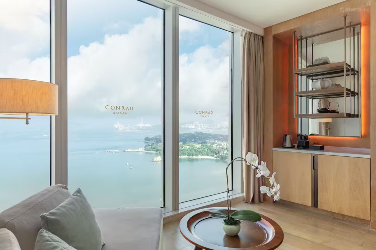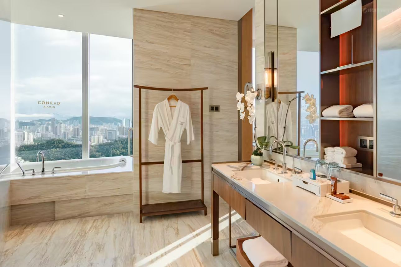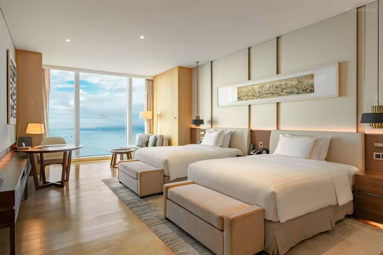 客房类型:厦门康莱德酒店拥有多种客房类型,包括豪华行政双床房和康莱德套房等。客房内配备先进的设施设备,如全景落地玻璃窗、休闲区、步入式衣帽间等,为宾客提供舒适的住宿体验。
