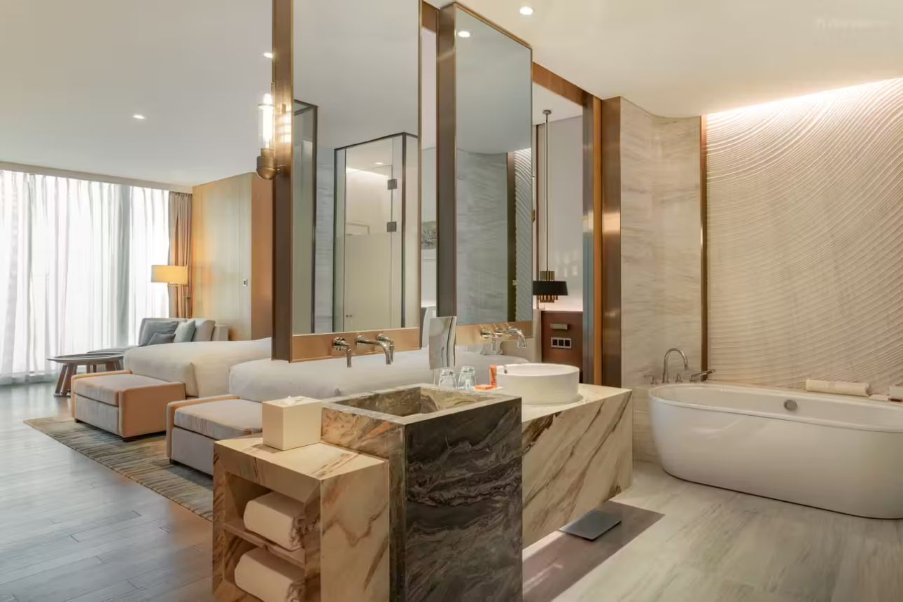 豪华客房与套房:酒店设有241间客房和套房,客房平均面积达到60平方米,宽敞舒适。房间内配备有高端设施,如48英寸液晶高清电视、宽敞明亮的独立浴室、双台盆和双喷头独立淋浴房、舒适的浴袍以及Byredo洗浴用品等。