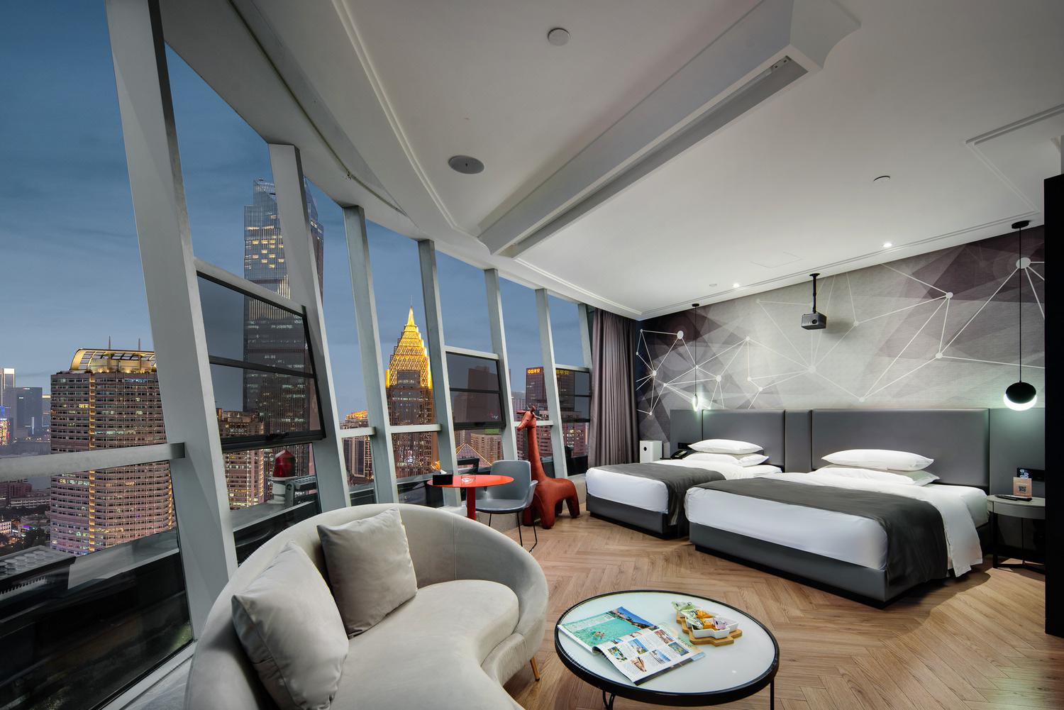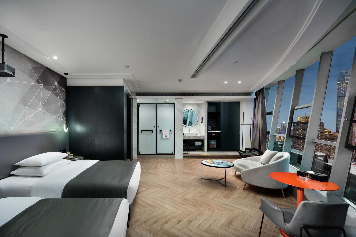 利设施:空调,书桌,多种规格电源插座,110V电压插座,遮光窗帘,自动窗帘,备用床具,房内保险箱,床具:鸭绒被,床具:毯子或被子,衣柜/衣橱,开夜床,客房WIFI,衣架,针线包,休闲椅,茶几,220V电压插座,沙发卫浴设施:拖鞋,24小时热水,吹风机,牙刷,洗发水,浴室放大化妆镜,护发素,香皂,浴帽,浴巾,浴衣,私人浴室,私人卫生间,淋浴电器多媒体:有线频道,液晶电视机,智能门锁,电影服务,音响食品饮品:电热水壶,冰箱,用餐区,茶包,软饮,水果,小食,瓶装水室外景观:城景,江/河景,山景,地标景洗浴用品:毛巾其他:双床:2.0; loft 跃层 | 云端江景超大床家庭套房「跃层大空间+零压床垫+赏城市霓虹+安心入眠」50平米 有窗 48层 |