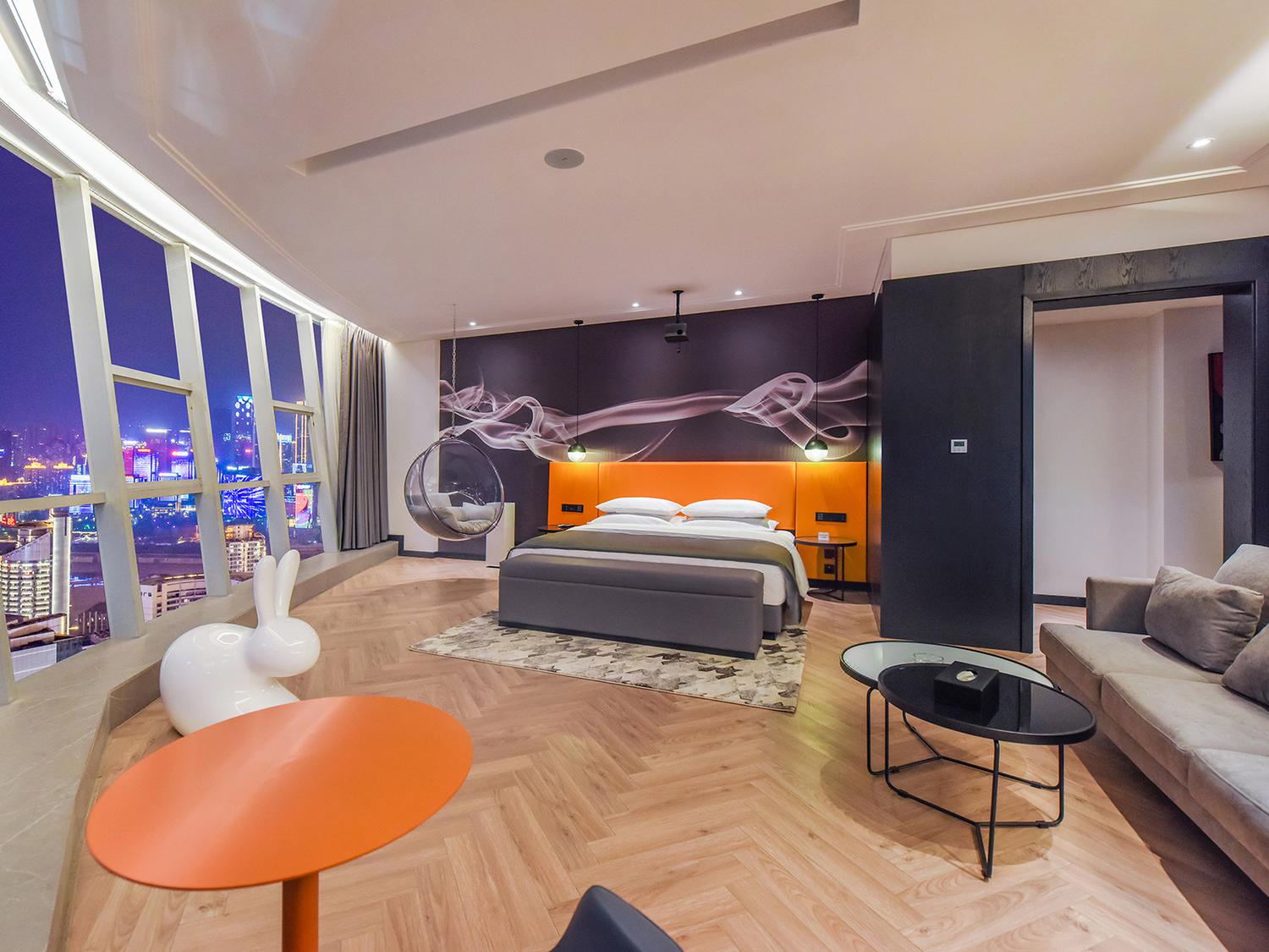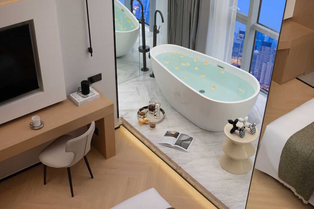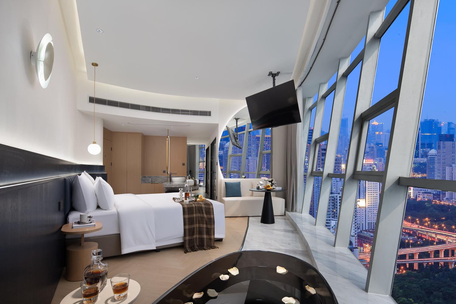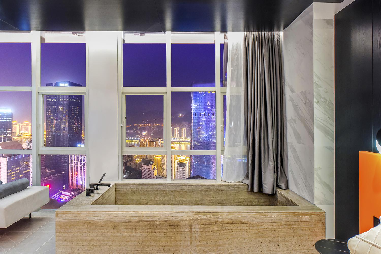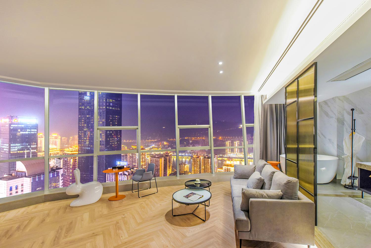 便利设施:空调,书桌,多种规格电源插座,110V电压插座,遮光窗帘,自动窗帘,备用床具,房内保险箱,床具:鸭绒被,床具:毯子或被子,衣柜/衣橱,开夜床,客房WIFI,衣架,针线包,休闲椅,茶几,220V电压插座,沙发卫浴设施:拖鞋,24小时热水,吹风机,牙刷,洗发水,浴室放大化妆镜,护发素,香皂,浴帽,浴巾,浴衣,私人浴室,私人卫生间电器多媒体:有线频道,液晶电视机,智能门锁,电影服务,音响食品饮品:电热水壶,冰箱,用餐区,茶包,软饮,水果,小食,瓶装水室外景观:城景,江/河景,山景,地标景洗浴用品:毛巾 loft 跃层 | 云端180度江景大床套房「跃层大空间+揽江日落+浪漫浴缸+智能智控」 45平米 有窗 48层 |