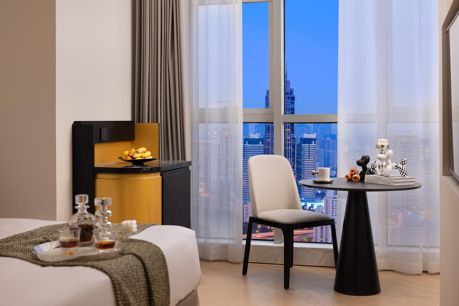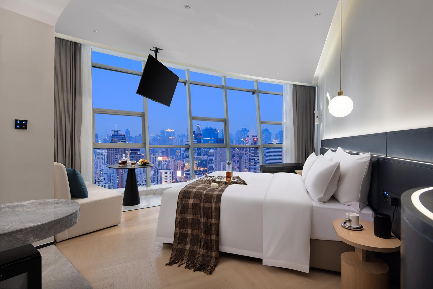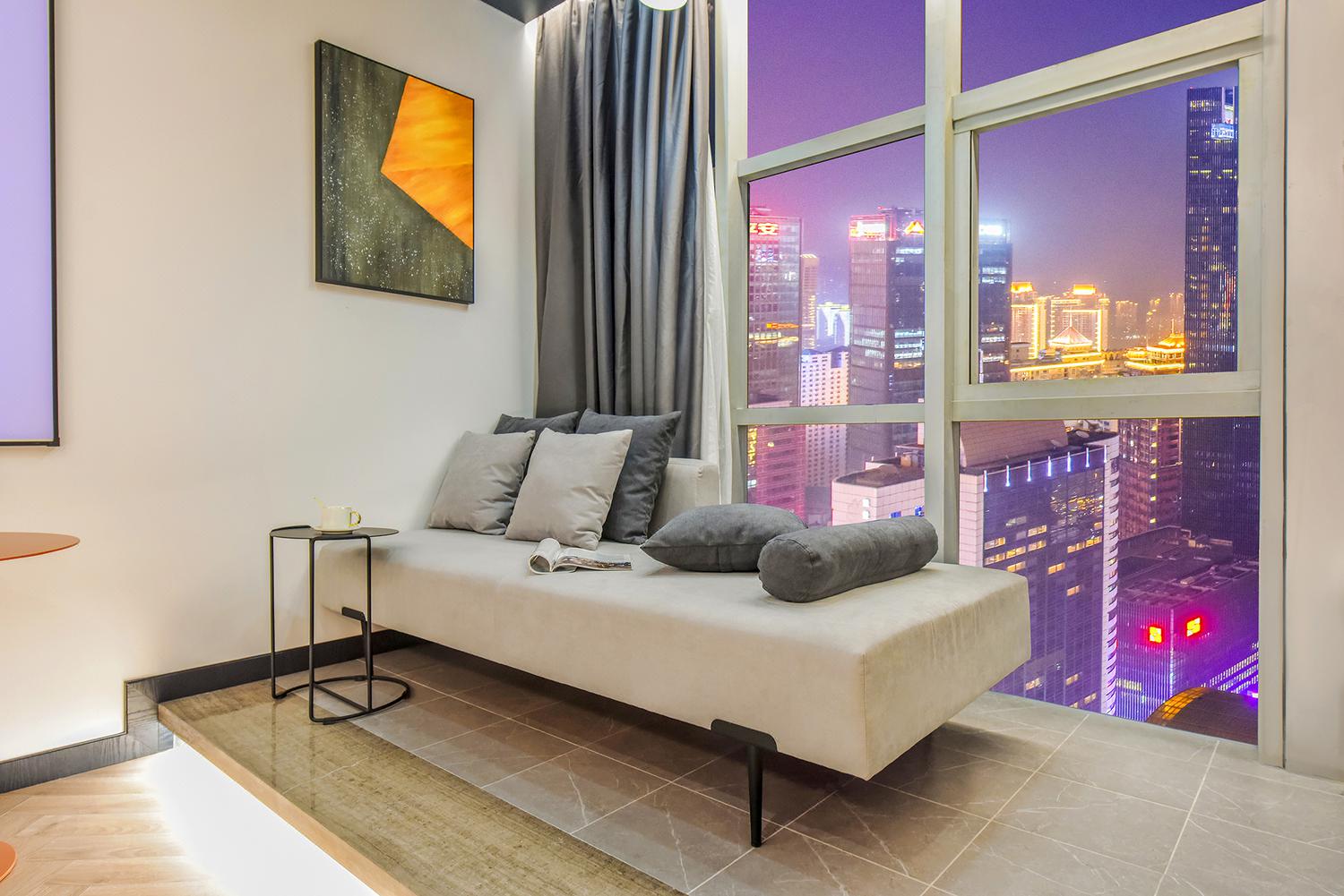 重庆S·island高空江景酒店地处重庆CBD——解放碑,毗邻解放碑步行街、朝天门码头、来福士等地标建筑。洪崖洞民俗风景区、八一路好吃街、长江索道等各热门网红打卡地近在咫尺;国泰艺术中心、十八梯等景点环绕四周。酒店楼下约200米便是地铁1/2号线交汇处——“较场口”站,出行便利,乘坐地铁就能快捷地到达全市各大景点和各大交通枢纽站。酒店房间可揽解放碑商圈全貌,可瞰长江、嘉陵江两江交汇,尽享渝中半岛的无敌夜景。每一间客房均配备了全自动操作系统,高级定制鹅绒被和洗浴用品、全景落地窗、超大屏电视、中央空调、独立wifi等设施应有尽有。酒店采用管家式服务,从入住前、到最后离店均有管家全程服务,为您的重庆之行提供全程的咨询和贴心服务。酒店清婉惬意的简约中又不乏繁复芬芳的勃勃生机,让身处在繁华喧嚣都市之中的你亦能体会到岁月的宁静与深远。房间装饰简洁而富有现代的设计感,屋内的一花一物,不多不少。每一个细节的铺排,都是恰到好处的舒适感觉。为你提供一个自在、放松的居停空间。在这里,能够休憩、充电、放松,是出行及旅游的不二选择。