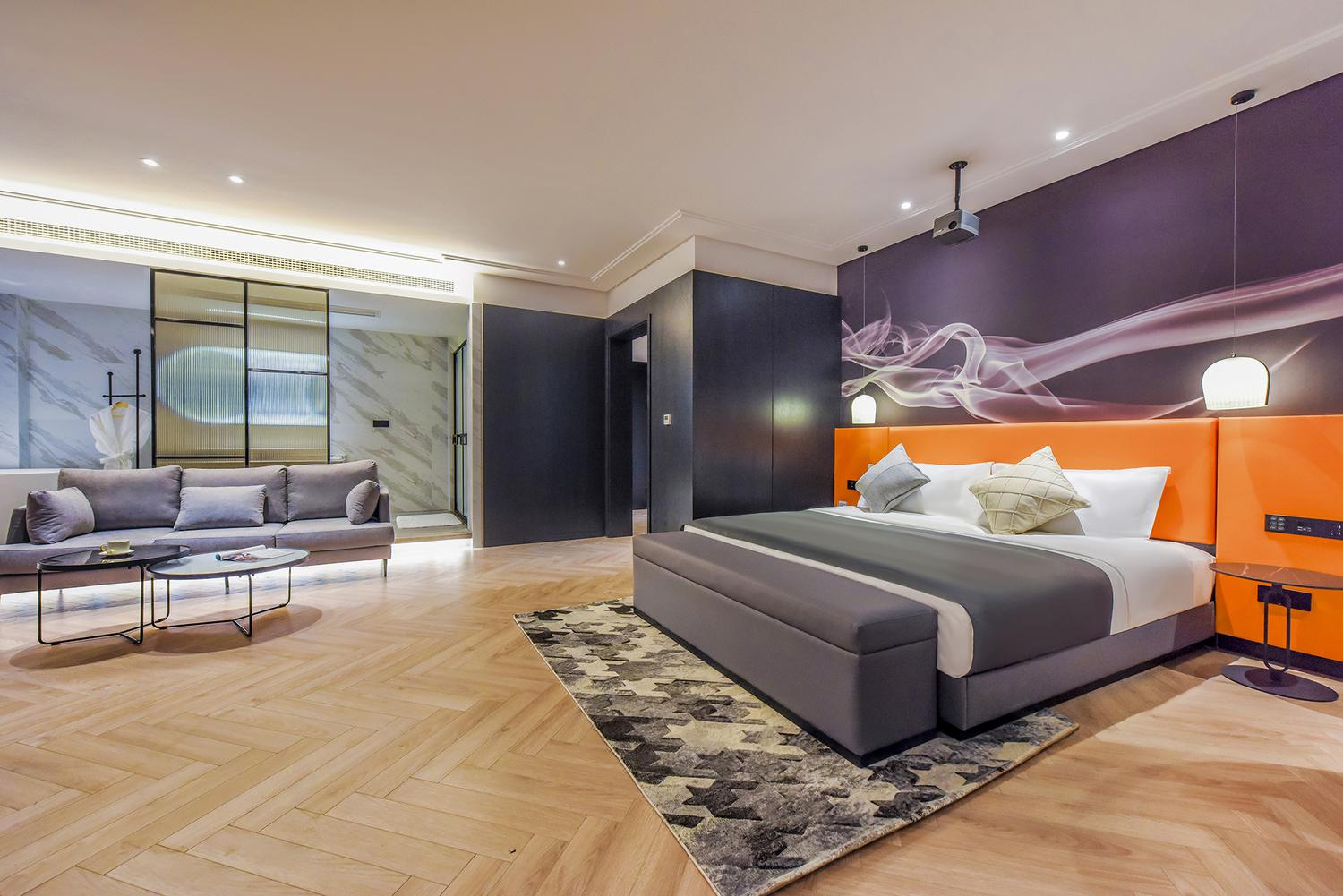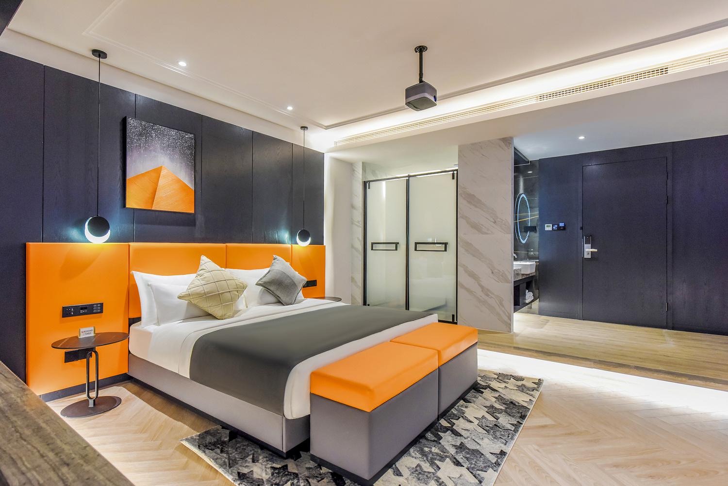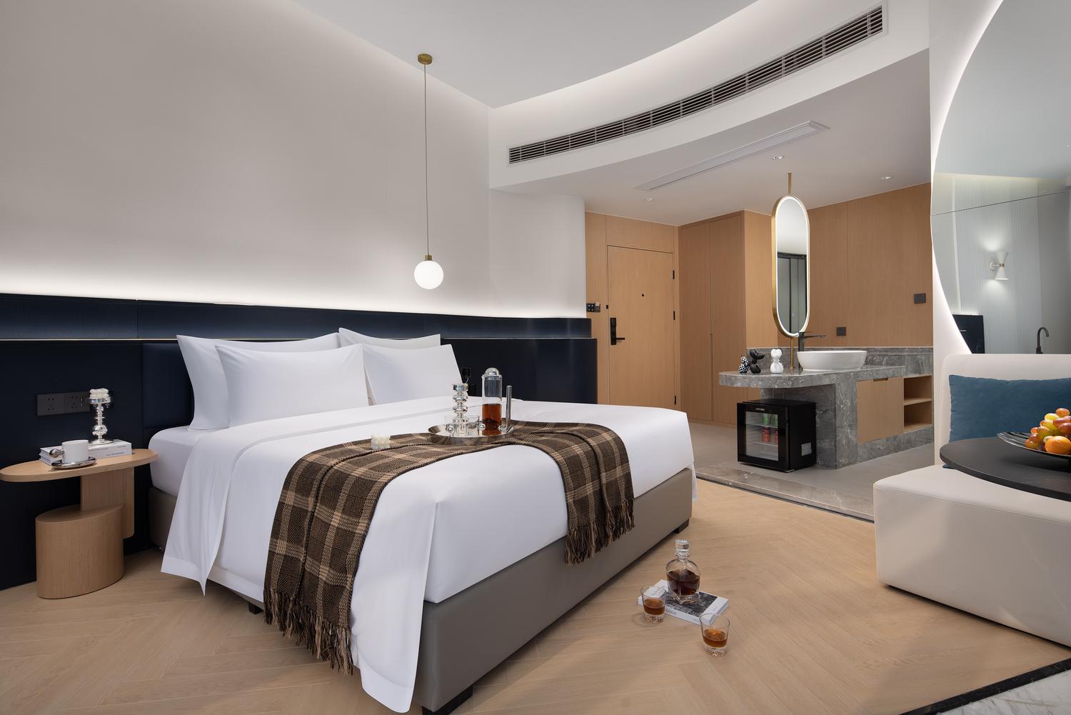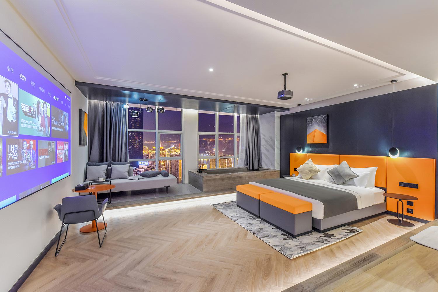 利设施:空调,书桌,多种规格电源插座,110V电压插座,遮光窗帘,自动窗帘,备用床具,房内保险箱,床具:鸭绒被,床具:毯子或被子,衣柜/衣橱,开夜床,客房WIFI,空气净化器,熨衣设备,衣架,针线包,休闲椅,茶几,220V电压插座,沙发卫浴设施:拖鞋,24小时热水,吹风机,牙刷,洗发水,浴室放大化妆镜,护发素,香皂,浴帽,浴巾,浴衣,私人浴室,私人卫生间电器多媒体:有线频道,液晶电视机,智能门锁,电影服务,音响食品饮品:电热水壶,冰箱,用餐区,茶包,软饮,水果,小食,瓶装水室外景观:城景,江/河景,山景,地标景洗浴用品:毛巾儿童及加床: 该房型允许携带儿童入住。13岁及以上客人按成人收费 床铺:每间客房限制6-12岁儿童,和成人共用现有床铺超过入住人数时,可能涉及额外费用,收费规则如下该房型不提供加床。该房型不提供加婴儿床。 云岩180度汤池江景大床房「4K高清巨幕投影+浪漫汤池+魔幻夜景江景」45平米 有窗 47层 |