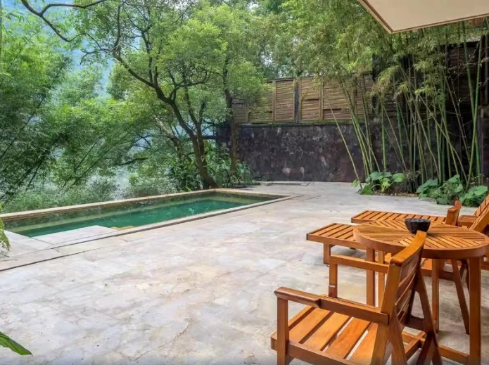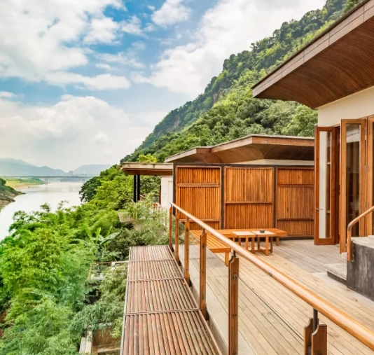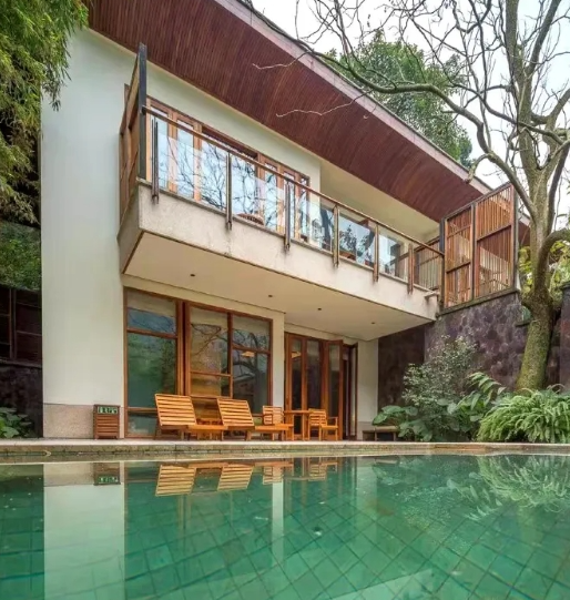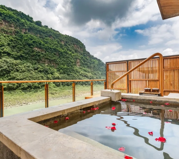 重庆柏联酒店坐落于历史悠久的北温泉公园,南倚缙云山,北临嘉陵江,与有着1600年历史的温泉古寺相依。酒店31间温泉别墅客房沿嘉陵江岸陡峻山体顺势而建,错落有致地隐映于苍翠山峦与滔滔江水间,透出无尽的清幽雅致和浓浓的书香诗意。