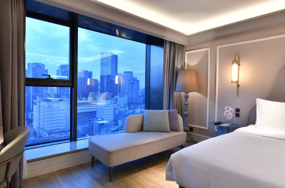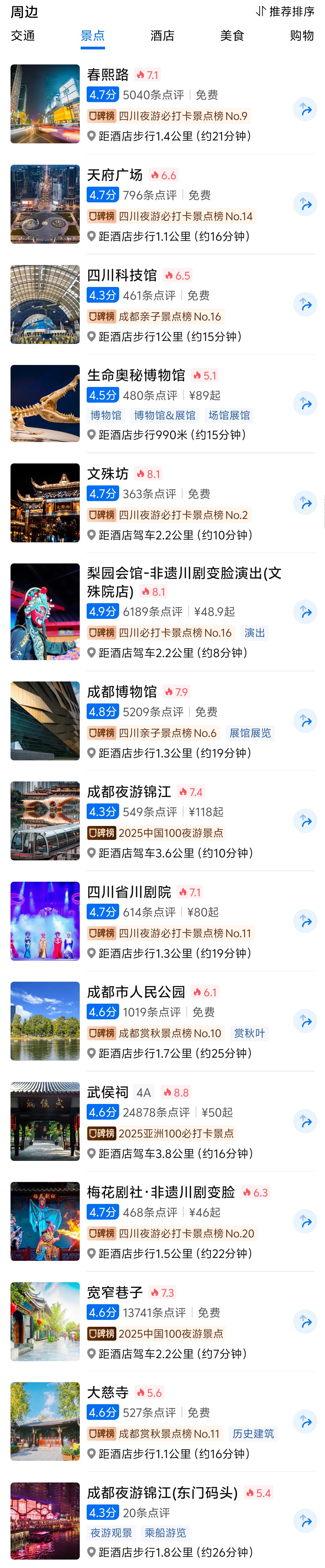 ·地理位置优越:酒店位于市中心,紧邻春熙路和太古里等商圈,步行即可到达多个热门景点,交通便利,周边餐饮和购物选择丰富。环境好评率99%。