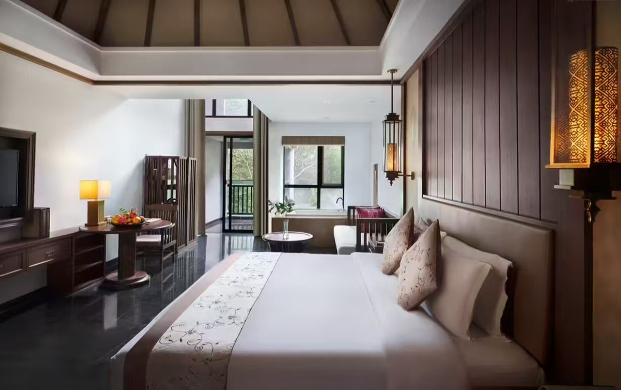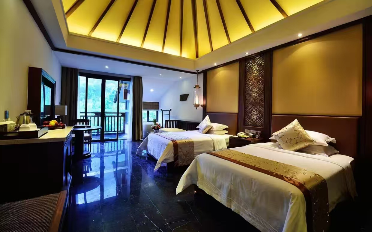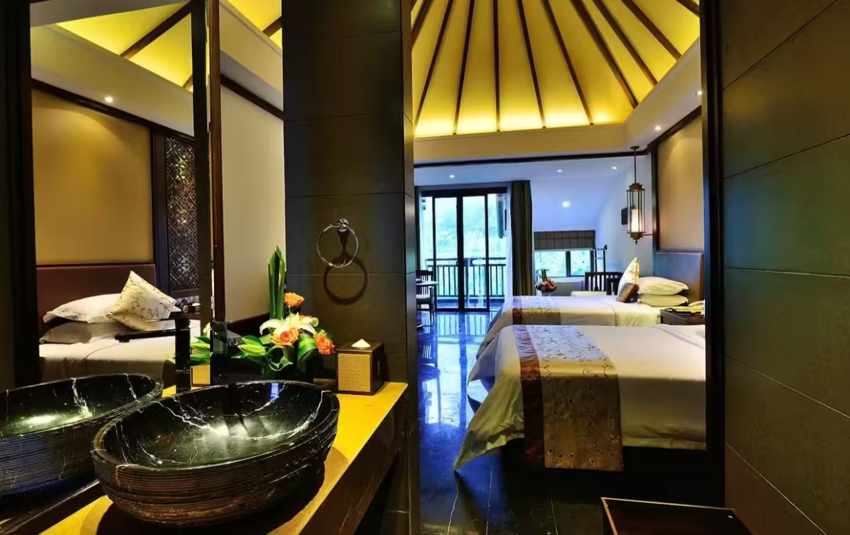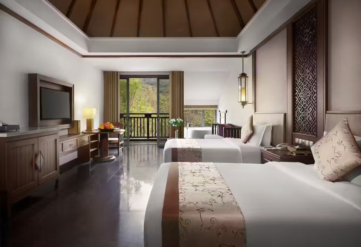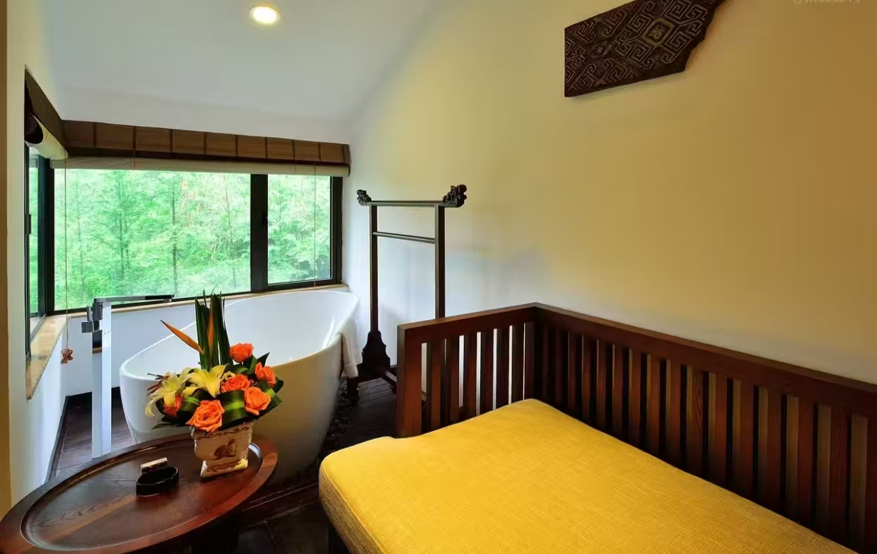 洗浴用品: 牙刷、牙膏、沐浴露、洗发水、护发素、香皂、浴帽、梳子、剃须刀 客房布局和家具: 沙发、衣柜/衣橱、书桌、茶几、休闲椅、餐桌、用餐区、私人入口、挂墙装饰画/字画、阳台、露台、花园/庭院 清洁服务: 每日打扫、熨衣设备、熨裤机 网络与通讯 客房WIFI免费、电话、国际长途电话 食品饮品 咖啡壶/茶壶、茶包、瓶装水免费、电热水壶、迷你吧免费 卫浴设施: 浴缸或淋浴、私人浴室、私人卫生间、智能马桶、吹风机飞利浦、浴室化妆放大镜、浴衣、毛巾、浴巾、24小时热水、拖鞋 室外景观: 山景、花园景、庭院景 客房设施: 空调免费、暖气、手动窗帘、遮光窗帘、特长睡床(超过两米)、床具:鸭绒被、床具:毯子或被子、备用床具免费 媒体科技: 液晶电视机、卫星频道、智能门锁 厨房用品: 冰箱 便利设施: 管家服务、房内保险箱、针线包、开夜、衣架、多种规格电源插座、110V电压插座、220V电压插座、雨伞、欢迎礼品 儿童政策 该房型欢迎携带儿童入住 儿童及加床该房型可提供加床、可提供加婴儿床