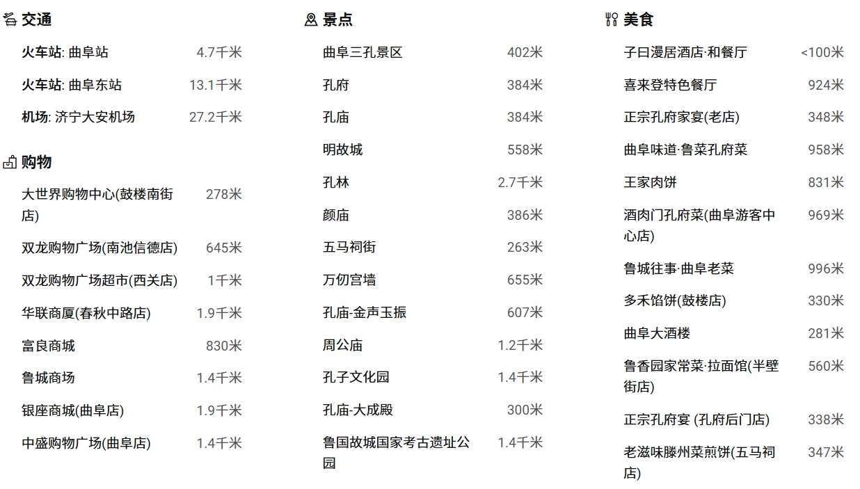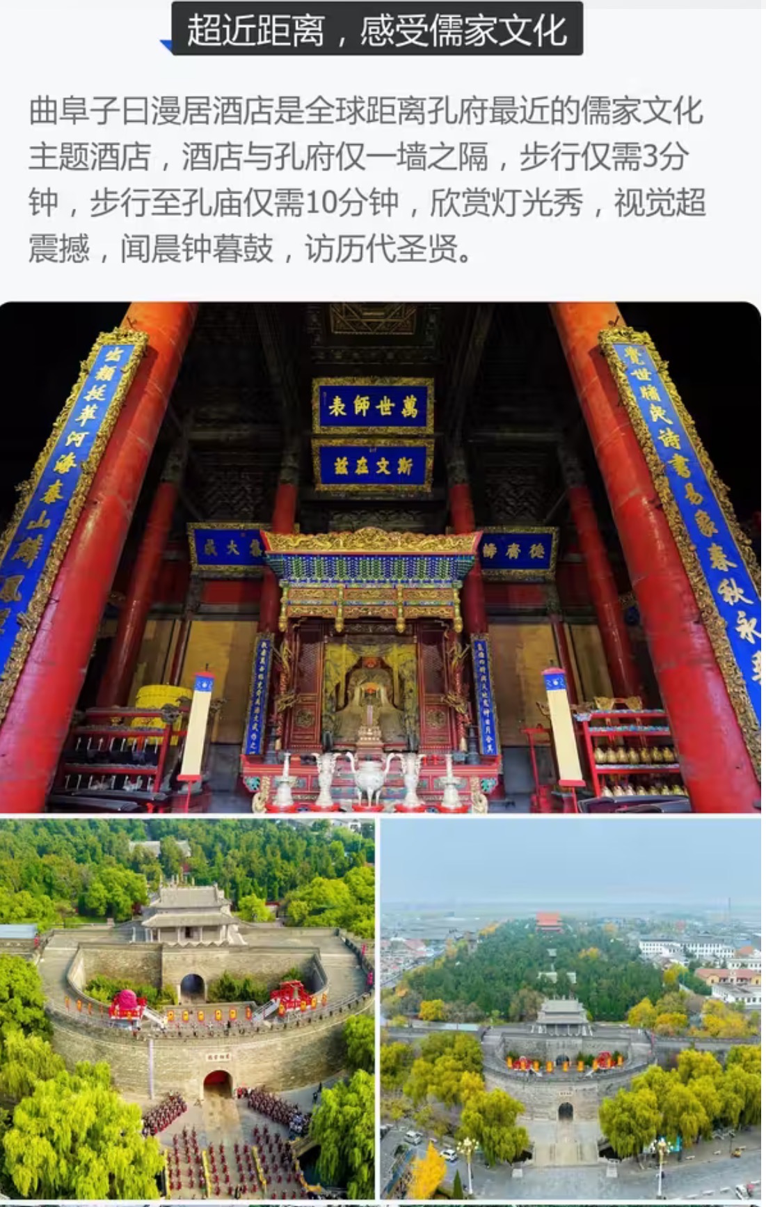 酒店位于繁华商业街—鼓楼北街,酒店对面便是世界文化遗产三孔景区,与孔府、孔庙仅一墙之隔,步行至景区约3分钟。邻近特色小吃街—五马祠街,步行约2分钟 ,步行至曲阜游客中心约15分钟,距大型购物商场—银座、百意超市车程约5分钟,交通方便。距尼山圣境车程约40分钟,可提供代招导游和尼山圣境景区直通车报名服务。这是一家综合性 儒家文化主题酒店,您可穿越古今,挥毫泼墨,汉服留影,抒发对儒家文化的热爱之情。酒店零压房——品质睡眠的开始:酒店所有房间配备整套零压乳胶床垫、零压乳胶枕头,助您深度好睡眠。酒店空调全部选用美的直流变频无风感独立式空调!酒店特色客房—星空房:更合适浪漫情侣入住哦、可以躺在床上看星星、看月亮,魅力夜色,尽收眼底;庭院房—我有一方庭院,胜过诗和远方。酒店设有自助洗衣房,可提供免费自助洗衣服务。酒店周边配套设施一应俱全,满足每位客人需求。酒店提供传统地道的孔家官府菜,“食不厌精,脍不厌细”,是孔子的论述,历来作为饮食名言相传。