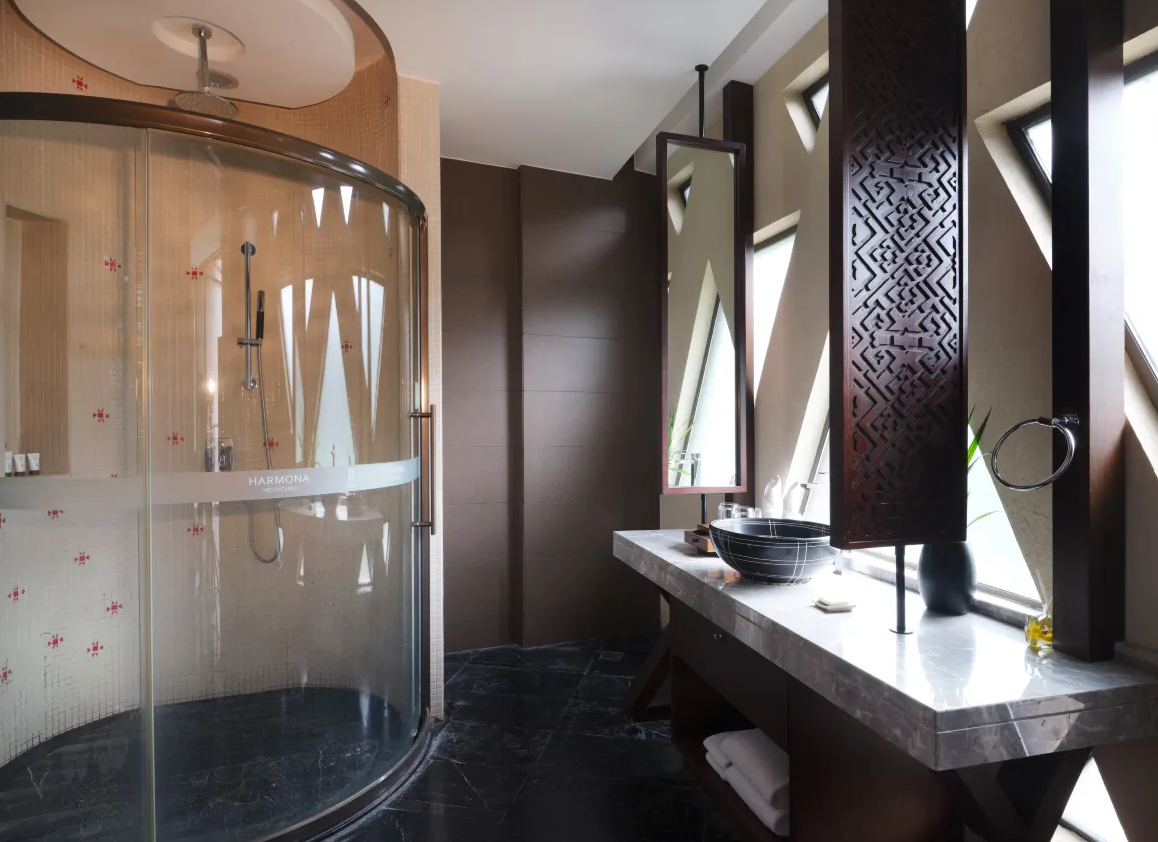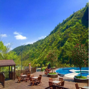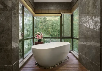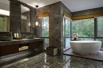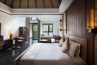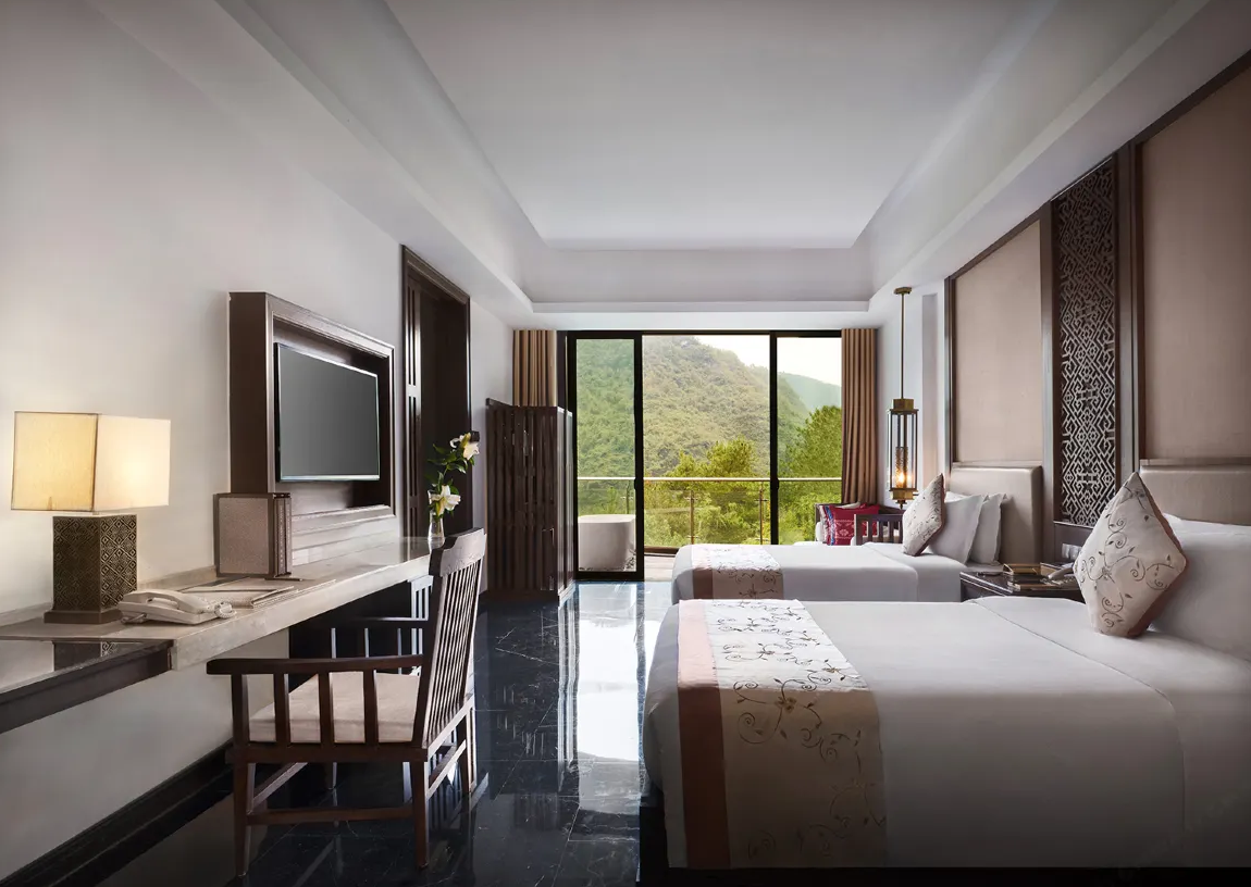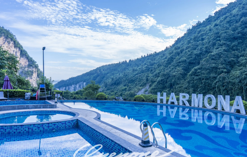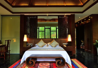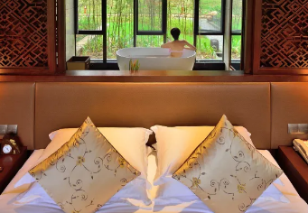 客房设施:酒店总房数 357 间,包括一期的普通客房和二期的别墅。房间视野开阔,均为山景房,配备 24 小时热水、独立卫浴、中央空调、智能电视、免费高速 WiFi 等。部分房间带有私汤池,床品采用亲肤棉麻面料,还融入了土家元素,如木梁悬挂西兰卡普织锦、墙面挂湘西山水画等。