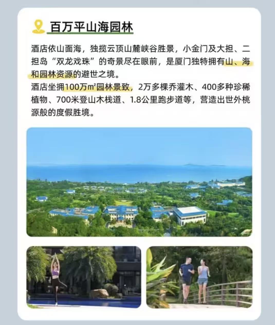 厦门海悦山庄酒店地处厦门风景旖旎的环岛路景区,依山面海,独揽云顶山麓峡谷,毗邻黄厝海滨浴场,小金门及大担、二担岛“双龙戏珠”的奇景尽在眼前,是厦门拥有山、海和园林资源的酒店。酒店坐拥100万平方米园林景致,20000多棵乔灌木、400多种珍稀植物、700米登山木栈道、1.8公里跑步道等,营造出自然与休闲交织的浓郁度假氛围。