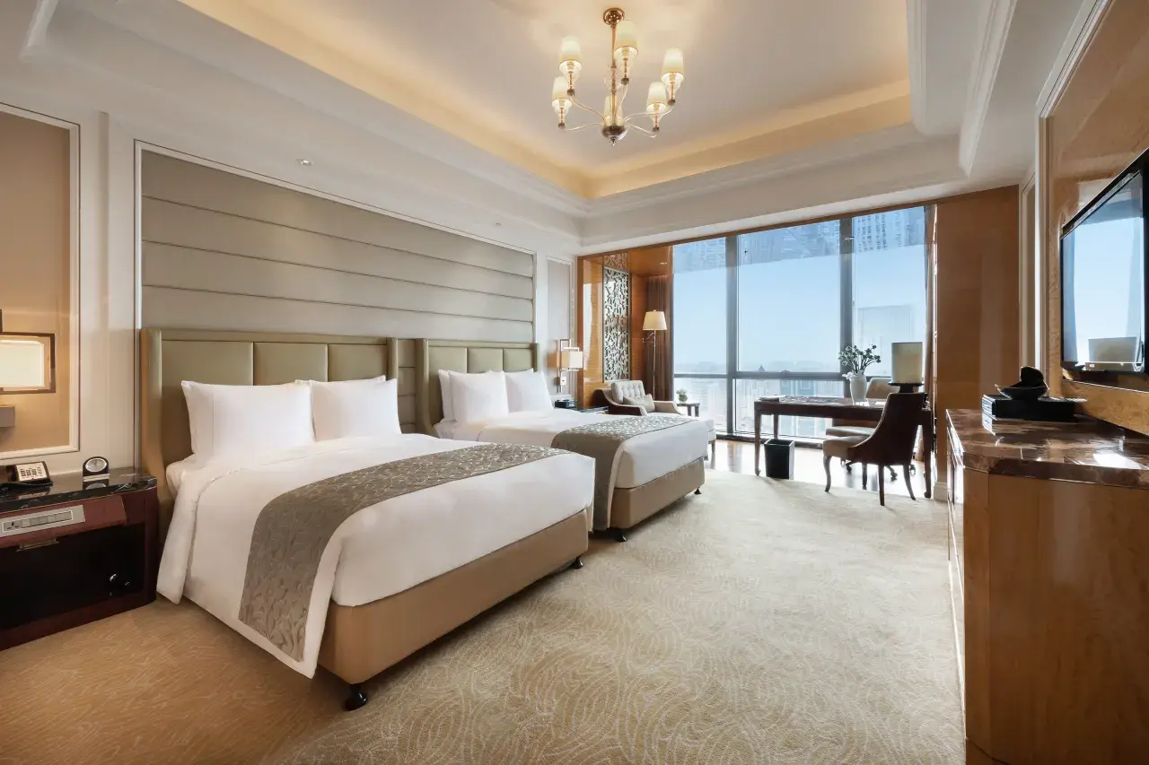 一、基础空间与布局 成都富力丽思卡尔顿酒店豪华双床房位于酒店高楼层(18-28 层),建筑面积约45-50 平方米,整体采用典雅的欧式奢华风格,搭配成都地域文化元素(如蜀锦纹样装饰、竹编艺术摆件),营造出兼具精致感与在地风情的居住氛围。房间布局通透合理,划分为睡眠区、休闲区、卫浴区三大功能板块,动线清晰,既保障私密性,又满足多人出行的互动需求,适合家庭游客或两位同行人士入住。 二、核心睡眠配置