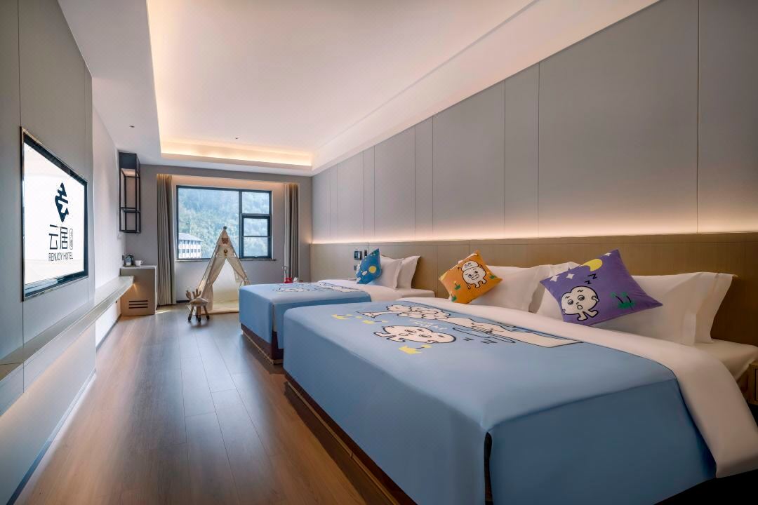 酒店属于锦江酒店(中国区)中高端国风艺文度假品牌,酒店位于湖南省张家界市武陵源区武陵大道318号,拥有各类特色客房,拥有中餐厅及自助早餐厅、云吧、手工室、自助洗衣房、健身房、户外游泳池、户外羽毛球场,地上及地下停车场、拥有180人多功能会议室及会议展厅,满足客人入住出行及度假体验的需求。酒店客房配有中英韩声控智能客控,高端床品、法国欧珑洗护系列、智能恒温马桶、浴缸浴袍等配备,为客人打造智能科技舒适的体验环境。清晏及嘉禧餐厅为宾客提供高品质健康饮食体验。酒店体验活动丰富,可以体验中国传统活动及非遗传承:云居六艺及云居五兴互动性课程活动,丰富您的住店时光。 云居RENJOY HOTEL推崇中国古代文人雅士的隐逸哲学,从大自然与优越的人文理念中获取灵感,云朵、水流、花草、树木、潮汐、光影、文化经典、民俗风情……无不成为云居建筑与空间设计的灵感来源,从而构建自然、幽静、舒适的居停空间,表达唯美、空灵、深远的意境,让宾客片刻间融入其中,纵然身处繁华都市,亦有“悠然见南山”的美妙心境。 【景点】酒店紧邻张家界武陵源风景名胜区-东门,核心景区天子山,步行至景区东门。