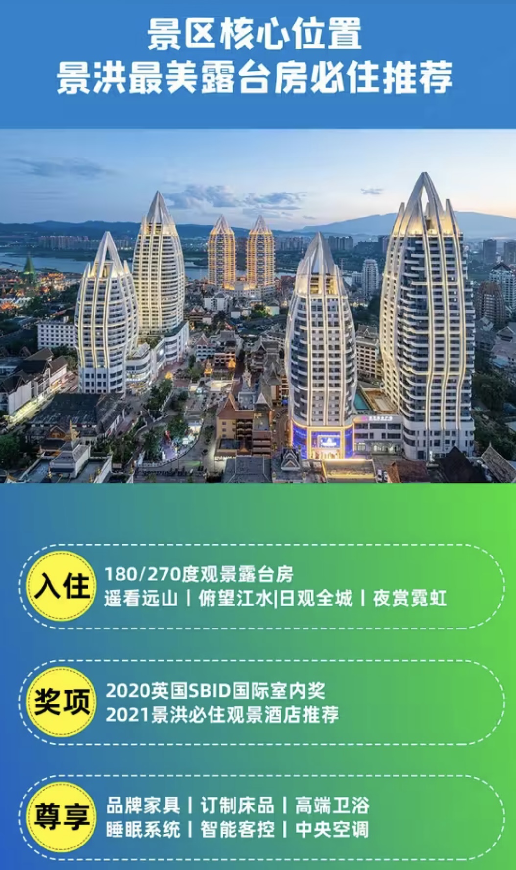 ✨西双版纳吉象谷酒店位于西双版纳景洪市,国家4A级度假区告庄西双景内,依托180度——270度的大广角客房露台,成为遥看远山、俯望江水、夜赏霓虹的全时段观景网红打卡点,酒店步行即至澜沧江、大金塔佛寺、六国水上市场 、达兰商业广场、时光影城、大兴量贩超市、孔雀大厦等地标,紧靠星光夜市、赶摆街夜市、水寨酒吧街、滨江步道等旅玩区域。同时地处交通枢纽,距高速路口仅2分钟,直达景洪机场、客运站及澜沧码头,十分钟直达勐泐大佛寺,热带花卉园,原始森林公园,西双版纳融创乐园、傣秀剧场等热门景点。