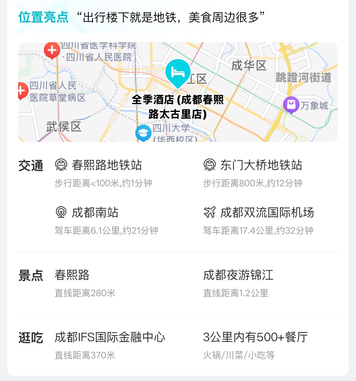 交通服务充电车位所处位置:酒店内充电方式:慢充类型:一般充电桩供应情况:车位紧张公共停车场收费所处位置:酒店附近停车场预约信息:不需要提前预约收费信息:每小时¥12亲子设施儿童餐儿童拖鞋儿童牙刷四 餐饮服务“饭店特别多,适合来成都旅游的人”咖啡厅大堂吧餐厅洗衣服务了解接送机服务