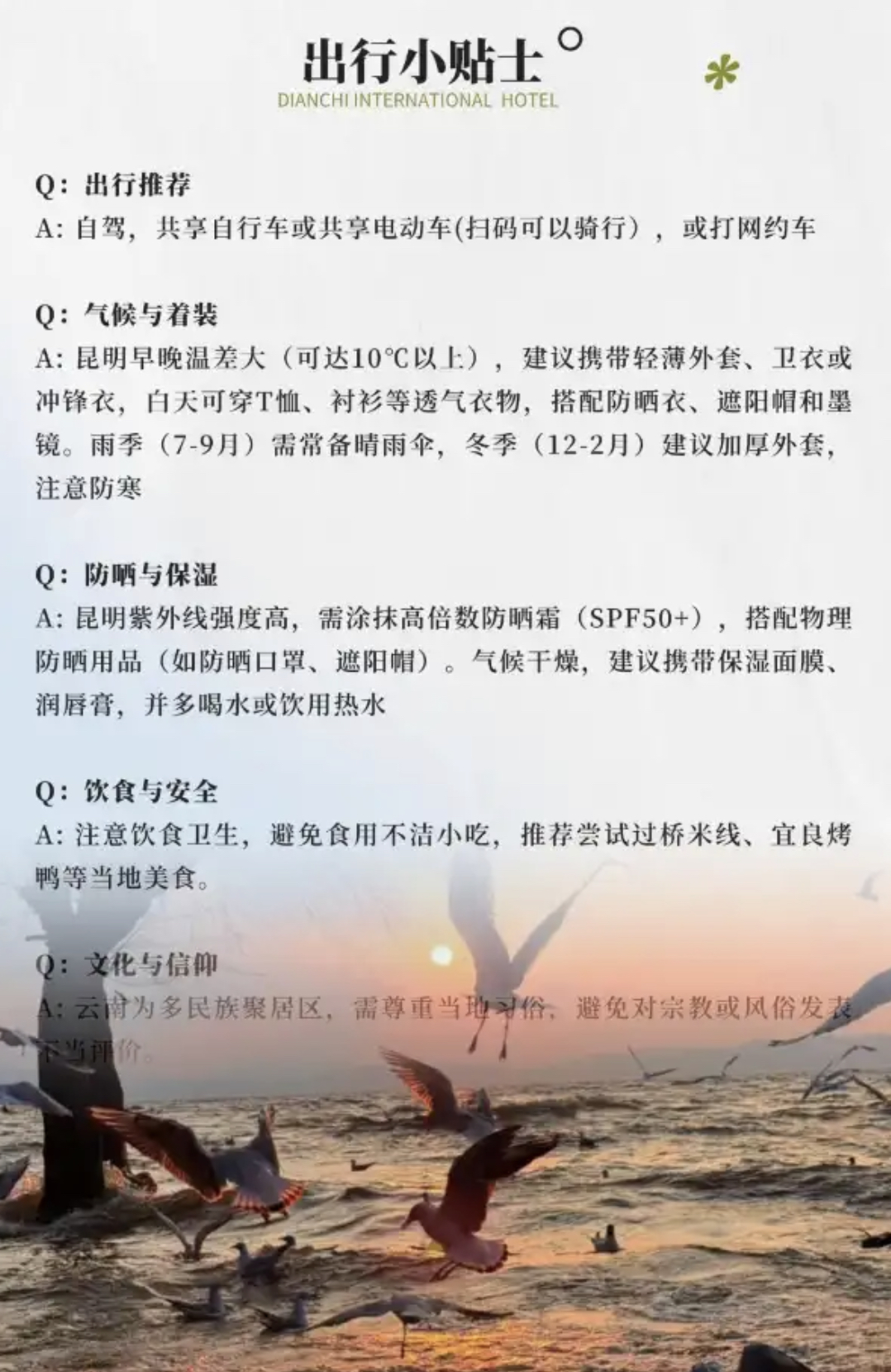 机场前往:距离昆明长水国际机场约 25 公里,打车约 40 分钟。也可乘坐地铁 6 号线到东部汽车站,换乘 4 号线到昌宏西路站下车,再步行或打车前往酒店。