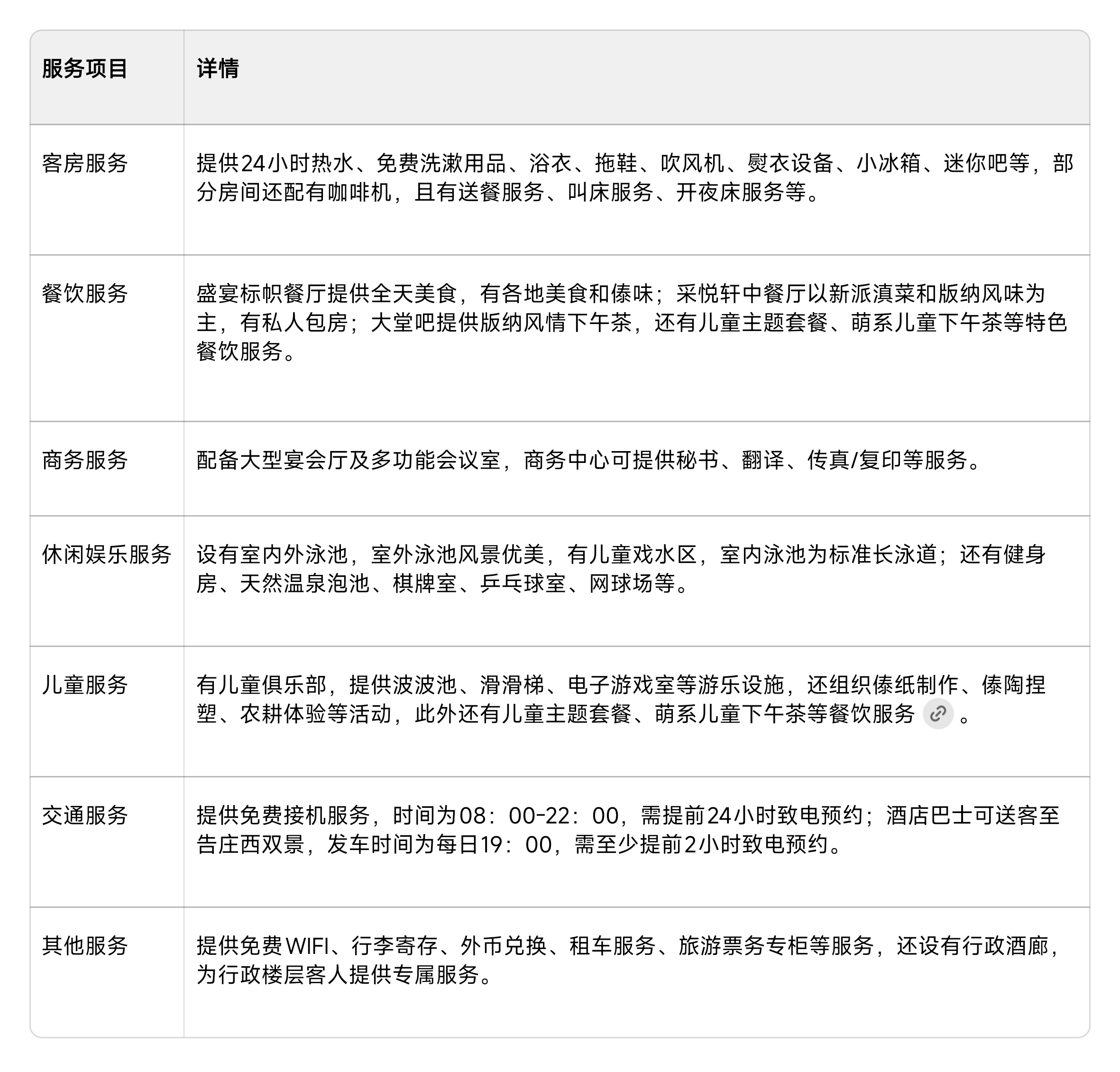 休闲娱乐:设有室内外泳池,室外泳池很大且风景优美,还设有儿童戏水区,室内泳池为标准长泳道;此外,还有器材齐全的健身房和天然温泉泡池,以及室内儿童乐园和丰富的亲子娱乐活动。