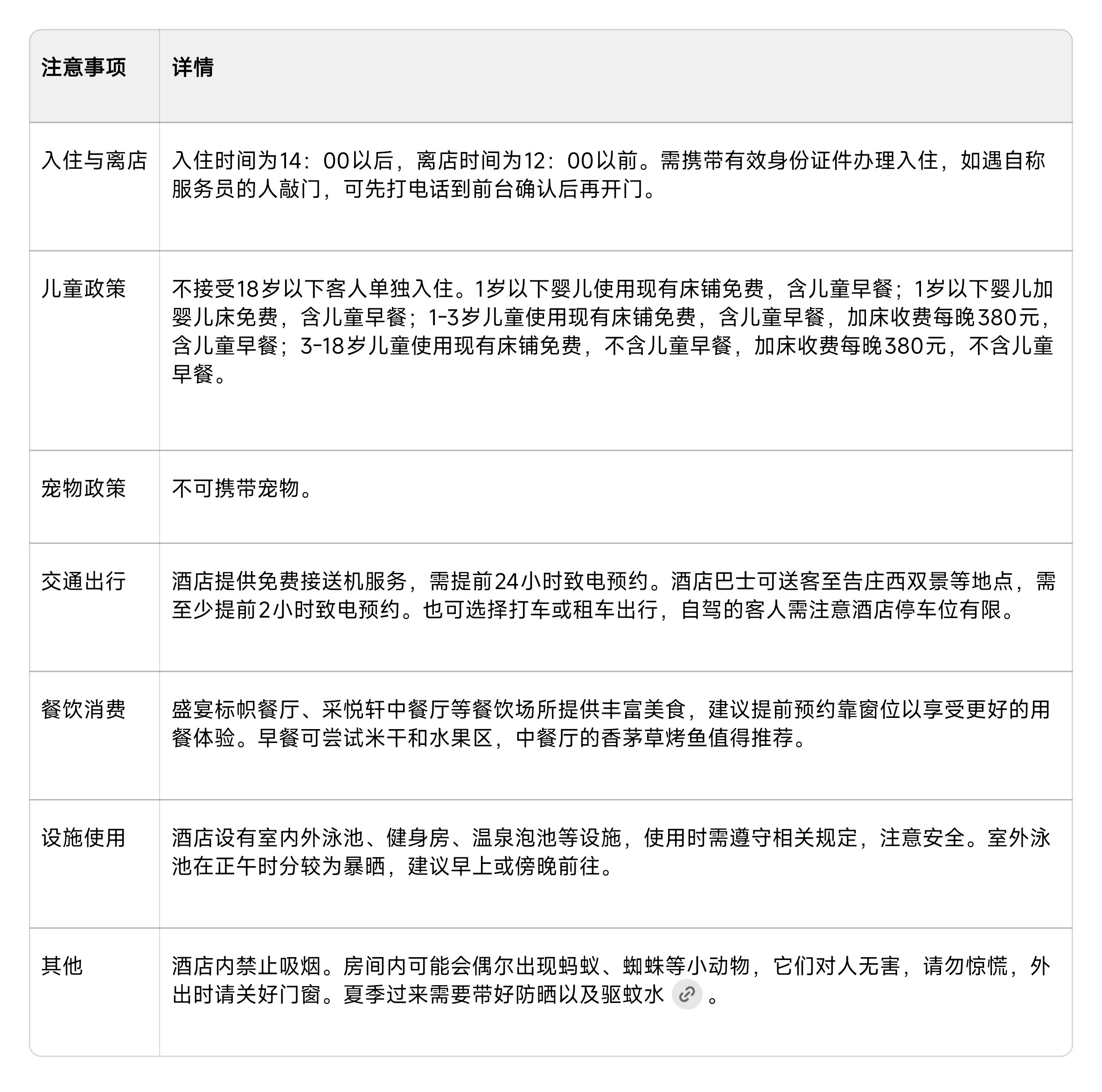 高铁站交通:酒店距离西双版纳站约6.4公里,驾车约13分钟。酒店有免费班车前往高铁站,发车时间为8:30、13:30、14:30,需至少提前2小时致电预约。