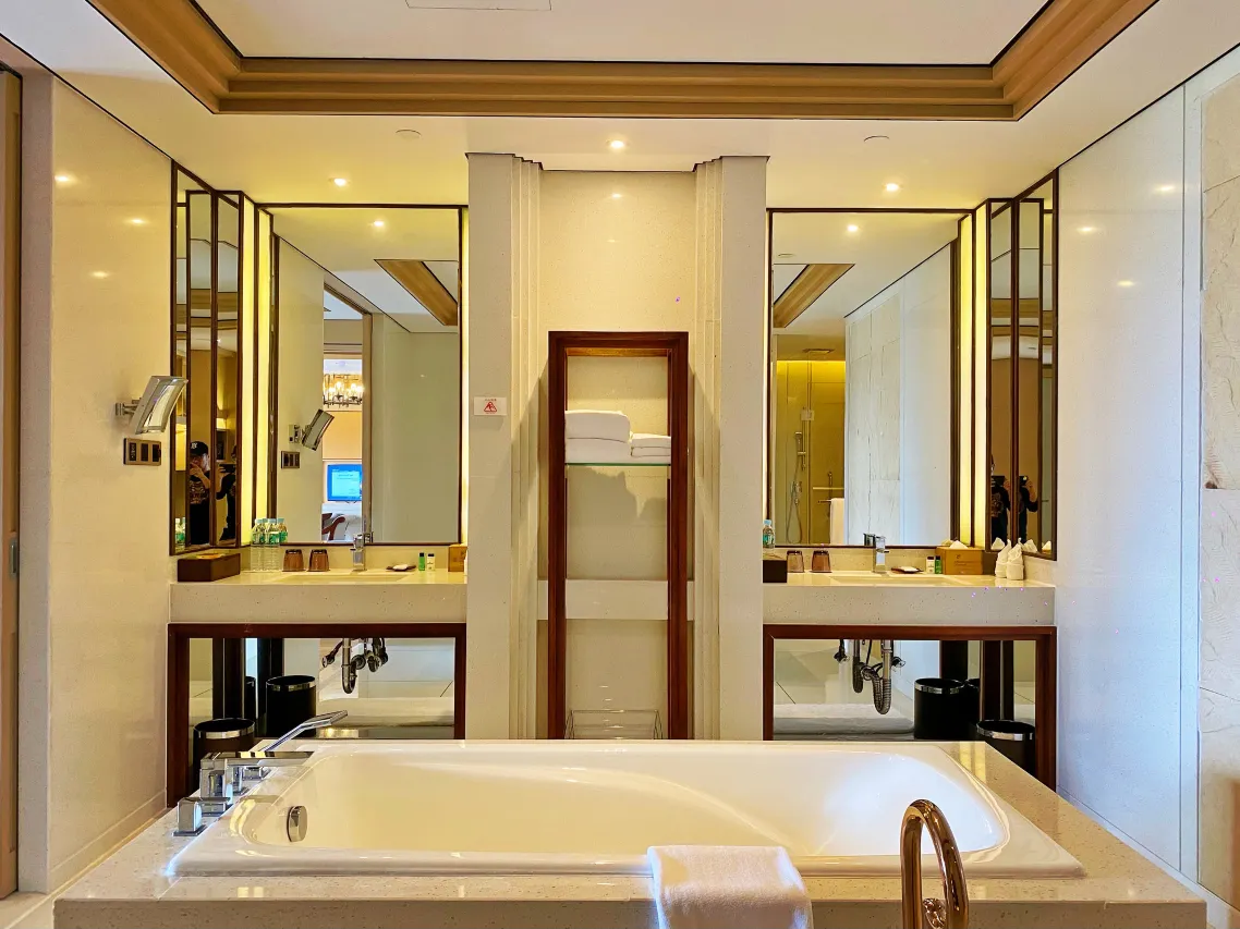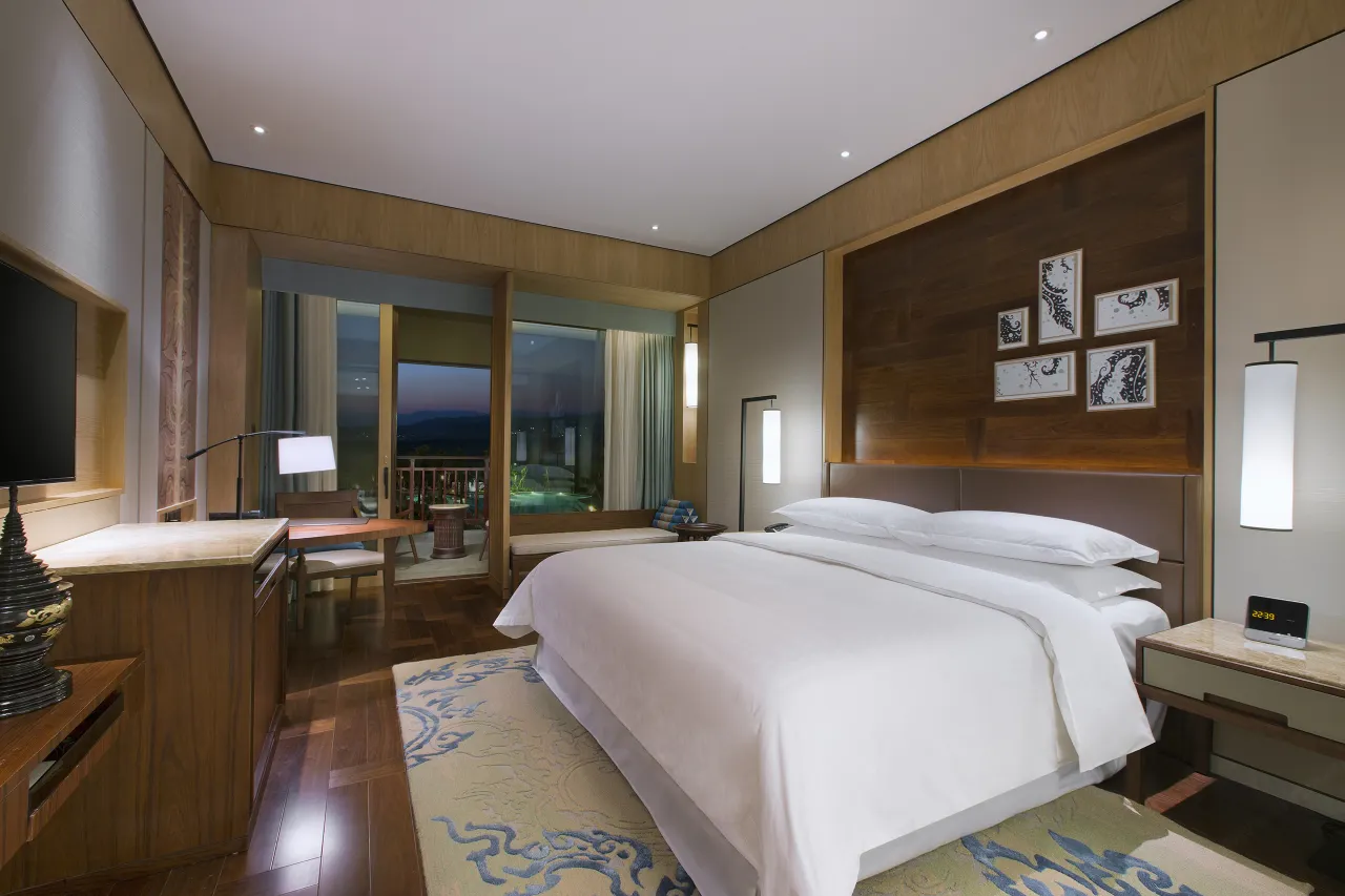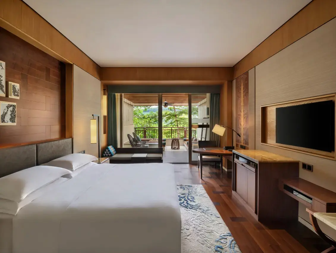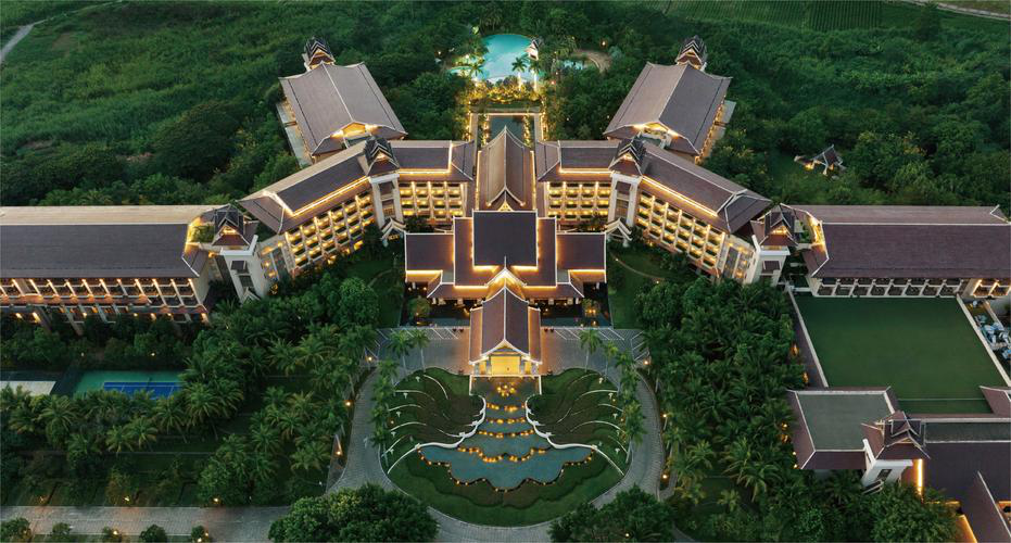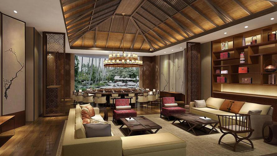 建筑与风格:酒店占地约13万平方米,整体设计以现代中式为基调,融合傣族建筑元素和文化特色,如大堂悬挂的傣式象牙鼓灯具,客房墙面的傣式层层叠级建筑式样等,充满傣泰风情。