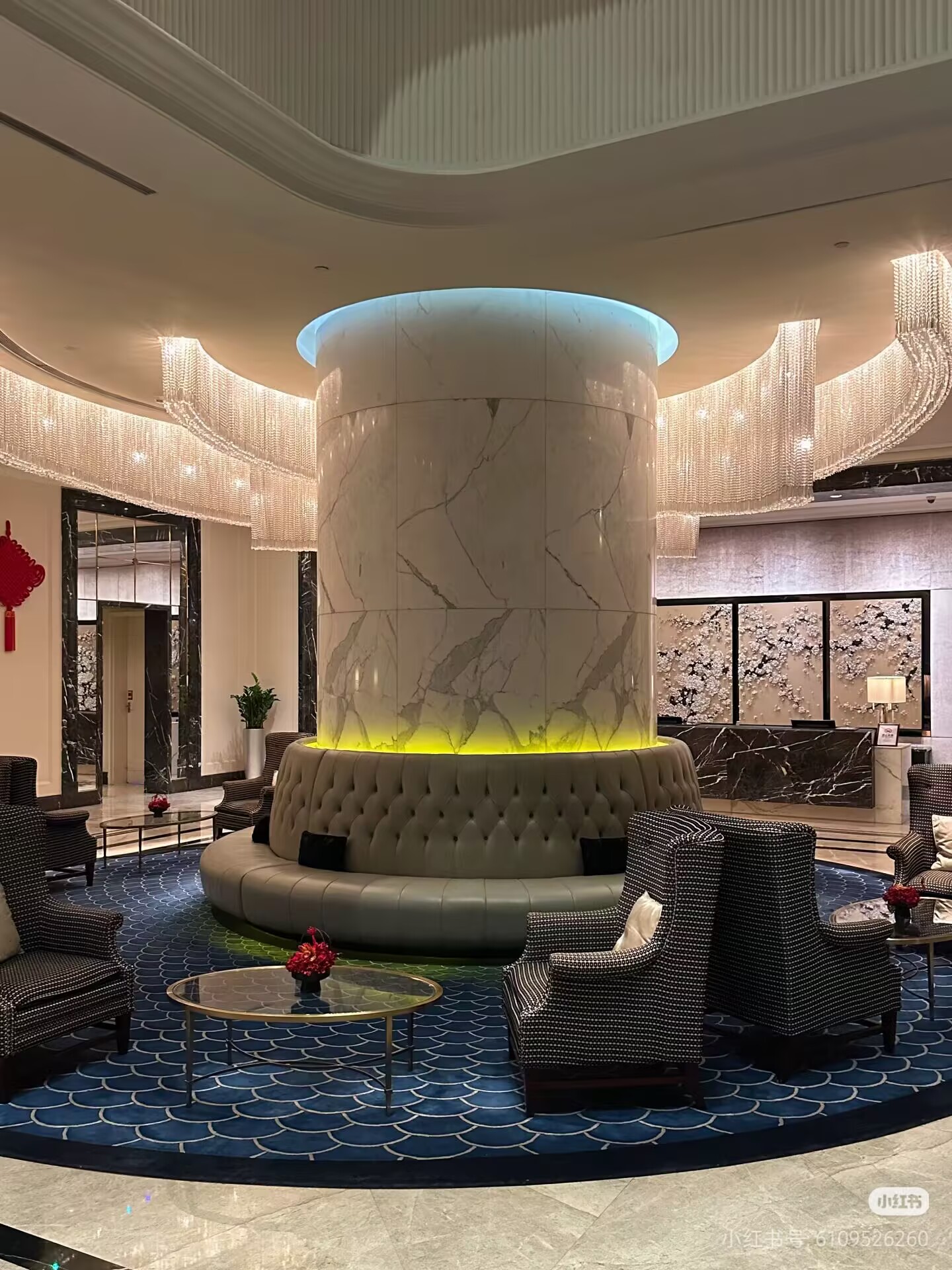 酒店以“欧式古典宫廷风融合东方韵味”为核心设计理念,标志性的“朗廷粉”为主色调,搭配满室新鲜粉色玫瑰花与专属姜花香薰,营造出浪漫典雅的氛围[__LINK_ICON]。1至4楼的复古水晶旋转楼梯是网红热门打卡点,从大堂到客房,深色木家具与柔软地毯形成悦目对比,东方艺术品与传统图案点缀其间,尽显尊贵质感[__LINK_ICON]。