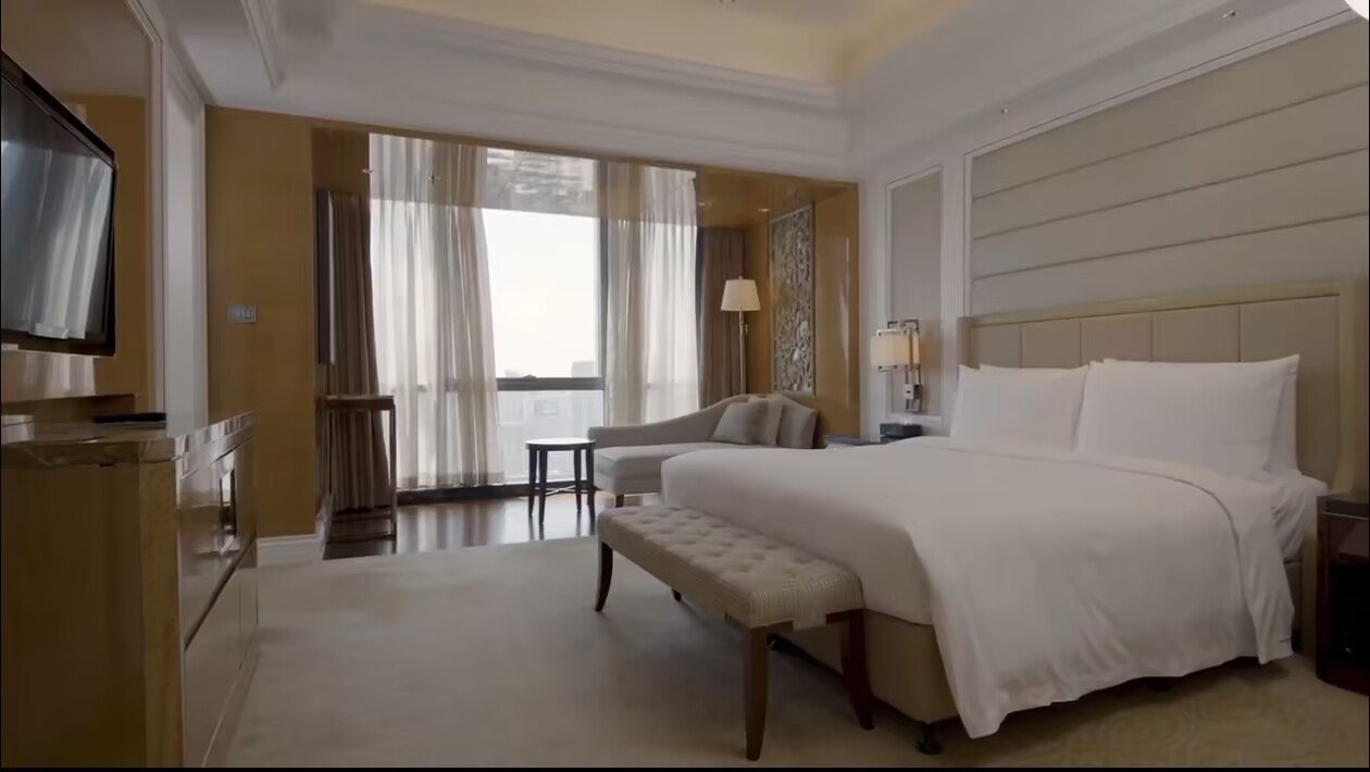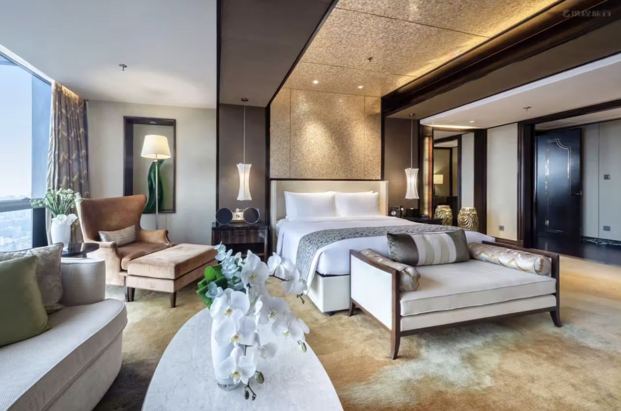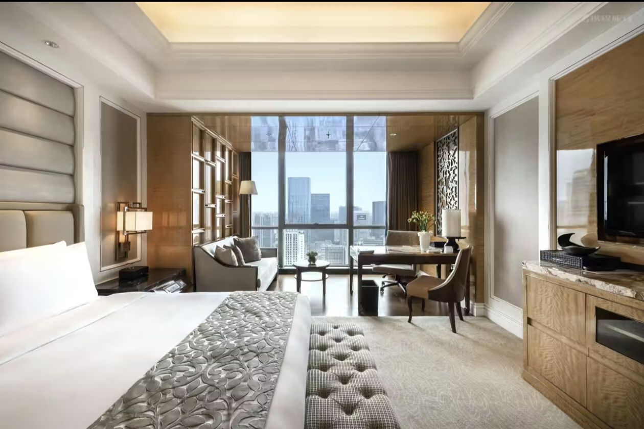 客房设施:拥有350间客房及套房,分布在酒店的23-41层,包括55间套房及113间行政客房。房间设计灵感源自成都传统老街院巷,均配有入门走廊、步入式衣帽间、双人盥洗池等设施,部分客房可俯瞰天府广场或远眺锦绣天府塔。