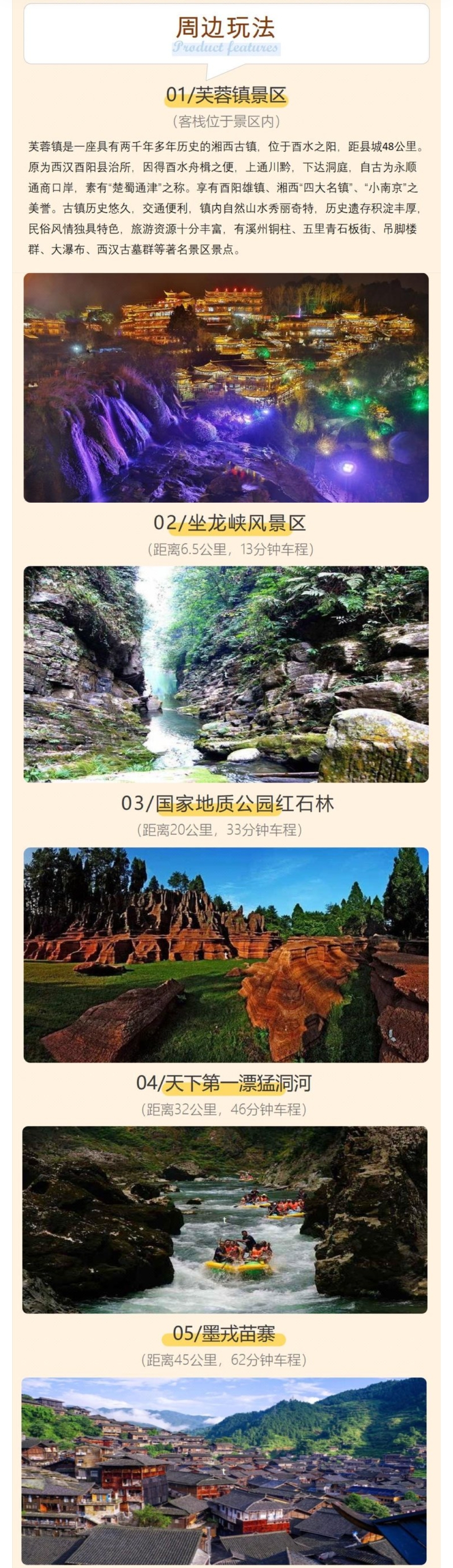 芙蓉镇景区:客栈背靠白河峡谷,门前即峡谷徒步入口,步行5分钟即可到达芙蓉镇景区。