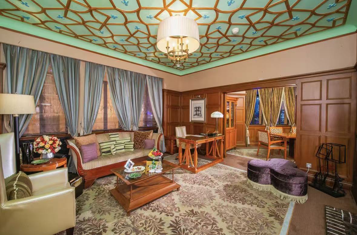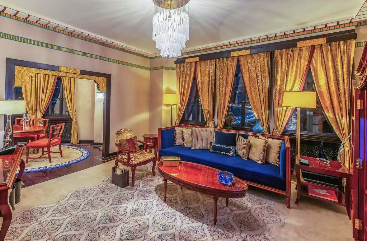 九国套房分别为中国、美国、英国、法国、意大利、西班牙、德国、日本和印度套房。其中,印度、英国、中国和美国套房在2007年修缮时直接沿袭和平饭店的原有风格,而法国、意大利、西班牙、日本和德国套房则在保持不同国家和历史风格的原有概念基础上进行了重新设计。 每间套房都有独立的会客厅和餐厅,餐厅可容纳8人享受私密晚餐,还设有迷你吧和Illy意式咖啡机。浴室内配有豪华的古典浴缸,并设有液晶电视屏幕。此外,套房还配备了飞利浦42英寸平面电视、Bose音乐ipod接入口、蓝光DVD播放机以及无线和宽带上网连接。 在装饰风格上,各国套房各具特色。如英国套房内有年代久远的木质地板、玫瑰花纹的顶部雕刻;美国套房内有宽阔的壁炉和Art Deco装饰派艺术;日本套房有和式移门和榻榻米;中国套房的半月形门廊充满民族特色;印度套房内有清真寺似的穹顶及明丽的色调配以印度特色的花纹装饰。 儿童设施服务