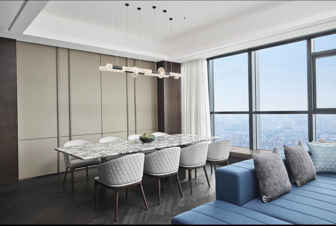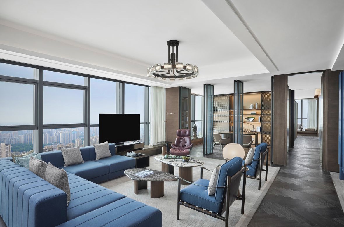 套房内设有独立的办公区,工作台对面配有两把椅子,方便与秘书或访客进行会谈。宽敞的客厅可用于接待重要客人,作为缓冲带确保了卧室等私人空间不被打扰。卧室配备豪华床品,提供舒适的睡眠体验。浴室设有Arto品牌的圆形按摩浴缸,可放松身心。此外,还有独立的衣帽间,空间宽敞,收纳功能强大。 房间内配备液晶高清智能电视、高速无线网络等现代化设施,同时提供行政酒廊礼遇。整体装修风格简约奢华,以暖色调为主,搭配典雅的画作和湖湘风光元素,营造出舒适且温馨的氛围。 客房设施