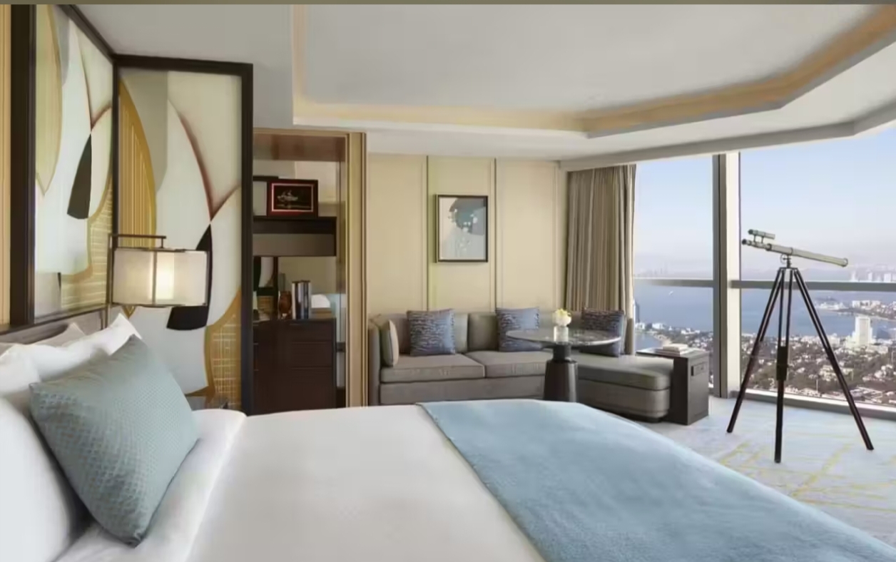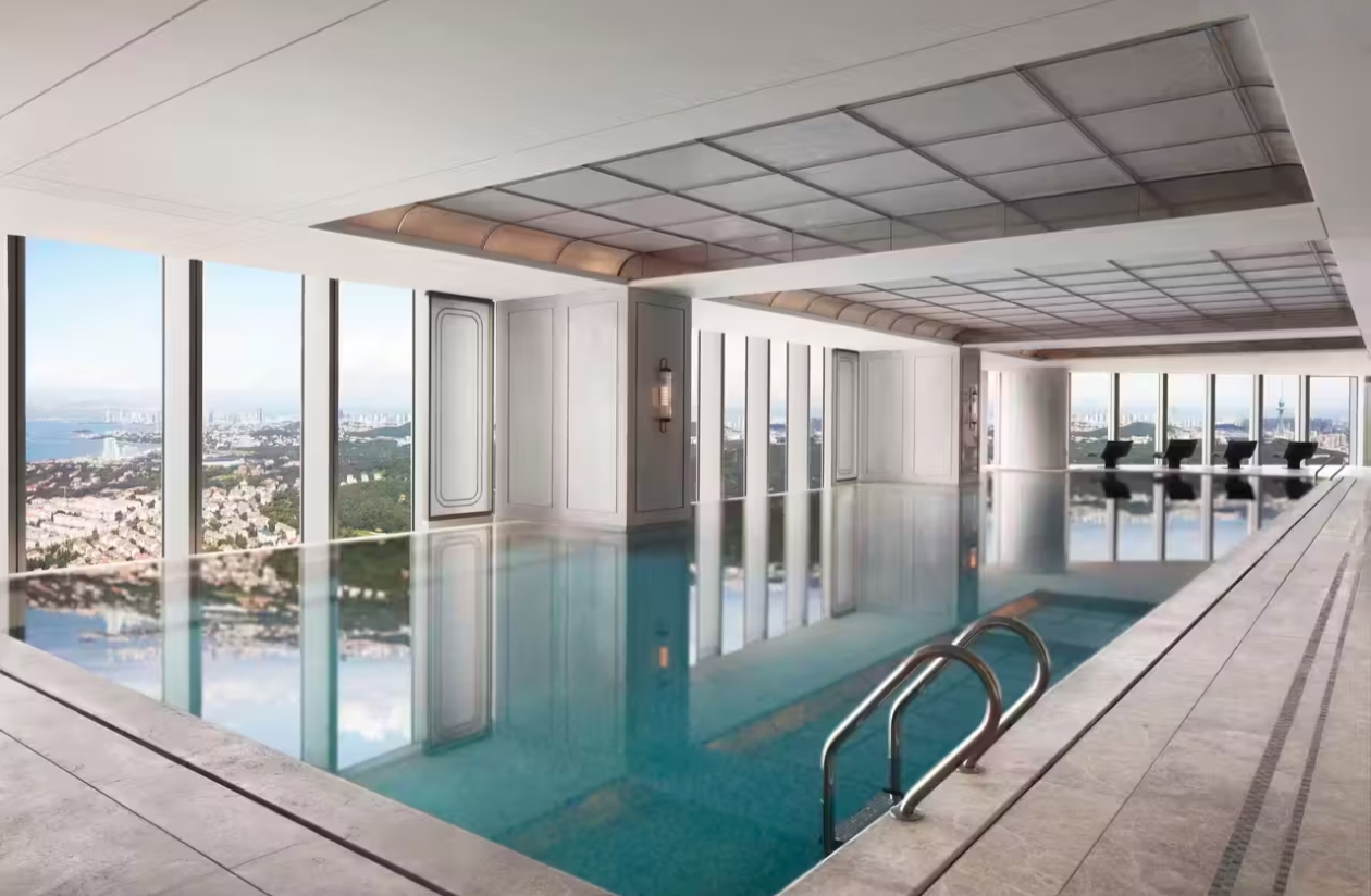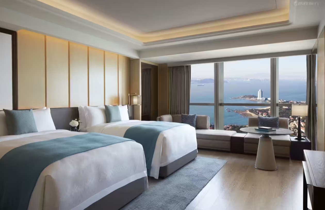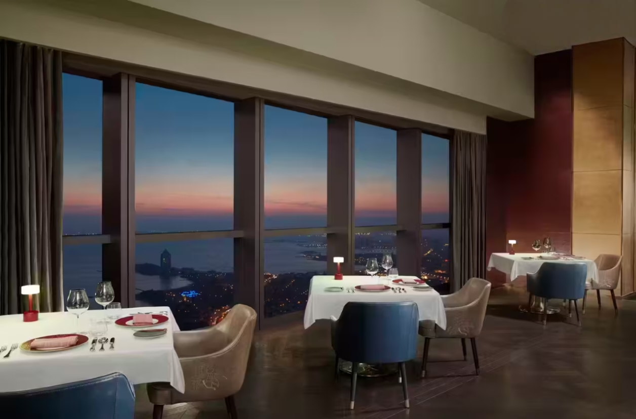 青岛瑞吉酒店雄踞369米海天中心,可眺望旖旎海岸线与城中丽景。