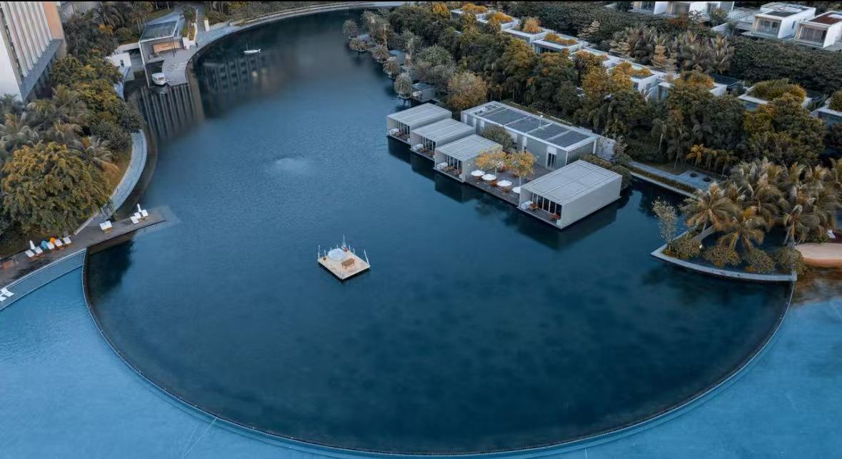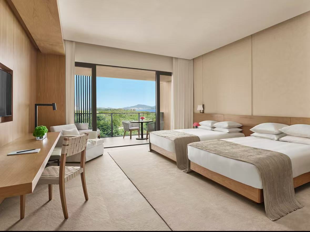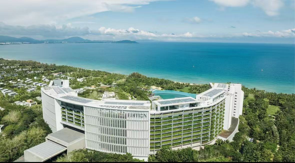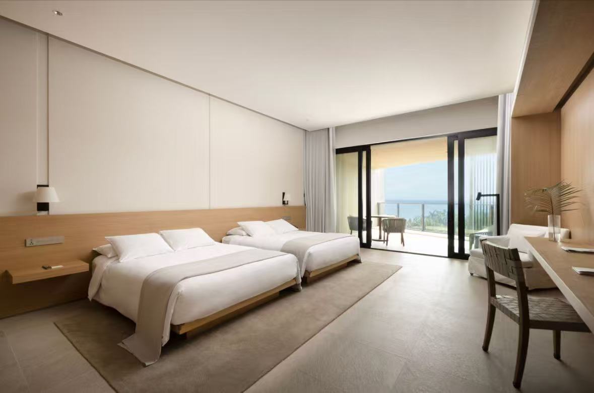 • 独特设计风格:由新加坡明星设计团队SCDA设计,整体采用现代极简风格,以白色为主调,搭配原木与灰色棉麻元素。挑高8米的大堂,垂落的藤编吊灯、木质长桌以及贝壳拼的海浪纹前台背景墙,营造出静谧高级的氛围,旋转楼梯更是成为网红打卡点。 • 优质客房体验:客房从基础房型到别墅均宽敞舒适,80%房型带露台/泳池,基础海景房有2.2米宽落地窗,可直面海棠湾。房间内配备Le Labo定制洗护用品,床垫为独家定制,床品是凉感面料,还有免费迷你吧首轮饮品等。 • 丰富餐饮选择:有海滩烧烤、星空吧、日料餐厅等多个特色餐饮
