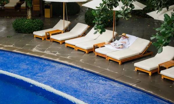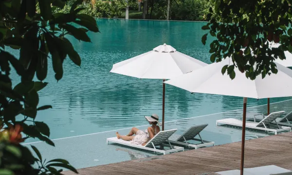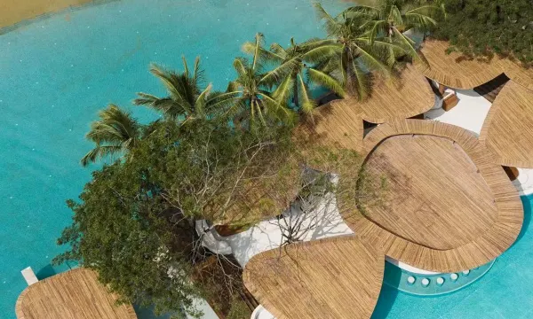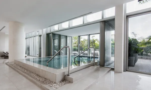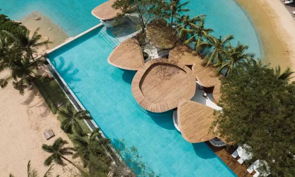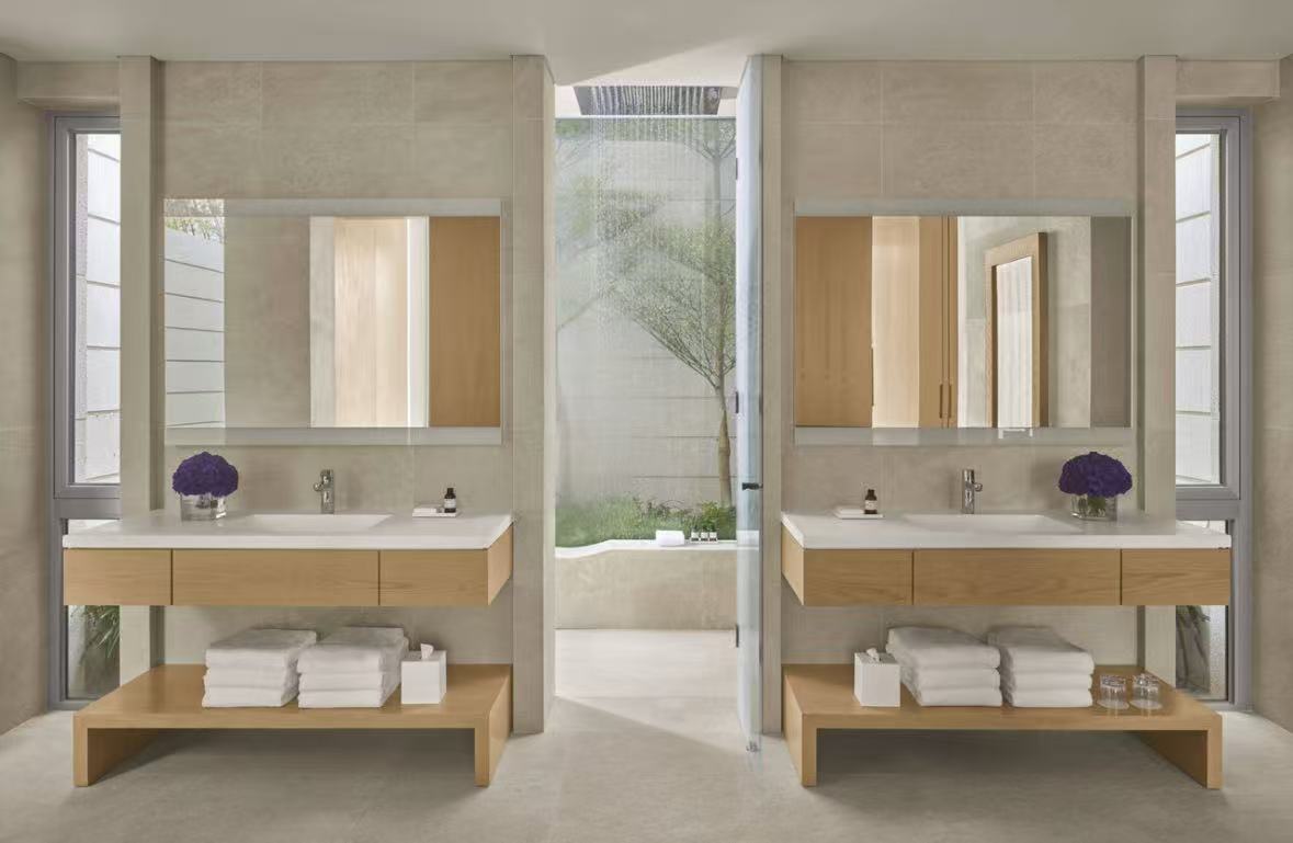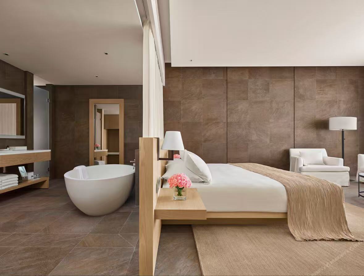 • 独特设计风格:由新加坡明星设计团队SCDA设计,整体采用现代极简风格,以白色为主调,搭配原木与灰色棉麻元素。挑高8米的大堂,垂落的藤编吊灯、木质长桌以及贝壳拼的海浪纹前台背景墙,营造出静谧高级的氛围,旋转楼梯更是成为网红打卡点。 • 优质客房体验:客房从基础房型到别墅均宽敞舒适,80%房型带露台/泳池,基础海景房有2.2米宽落地窗,可直面海棠湾。房间内配备Le Labo定制洗护用品,床垫为独家定制,床品是凉感面料,还有免费迷你吧首轮饮品等。 • 丰富餐饮选择:有海滩烧烤、星空吧、日料餐厅等多个特色餐饮