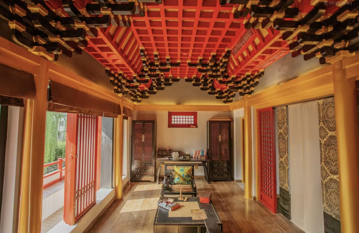 ·环境设计:酒店整体采用唐风复古设计,融合古典园林艺术与现代住宿功能,设有小桥流水、曲水流觞的庭院景观,部分房间正对竹林或秦淮河,营造出沉浸式的唐代生活场景。房间内部装修以扬州、敦煌、洛阳、长安等主题命名,配备金丝楠木家具、真金箔装饰及古董收藏品,细节处体现历史还原度,如雕花门窗、铜锁设计、壁画装饰等,整体风格古色古香,极具视觉吸引力。