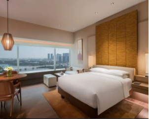 外观:酒店外观极具看点,湖景、桥梁、城市建筑相映成趣的整体景观,满目绿意与建筑的现代感交织,呈现出一幅优美的城市画卷。酒店建筑本身设计现代大气,更有“HYATT REGENCY”标识的醒目呈现,同时户外还设有精致的草坪活动区域,可满足各类社交、活动需求,从外观便可感受到酒店的高端与活力。