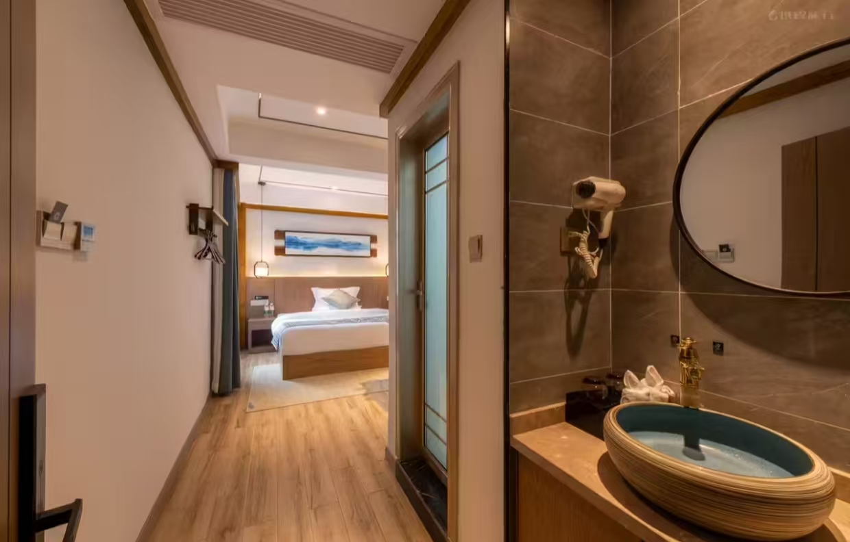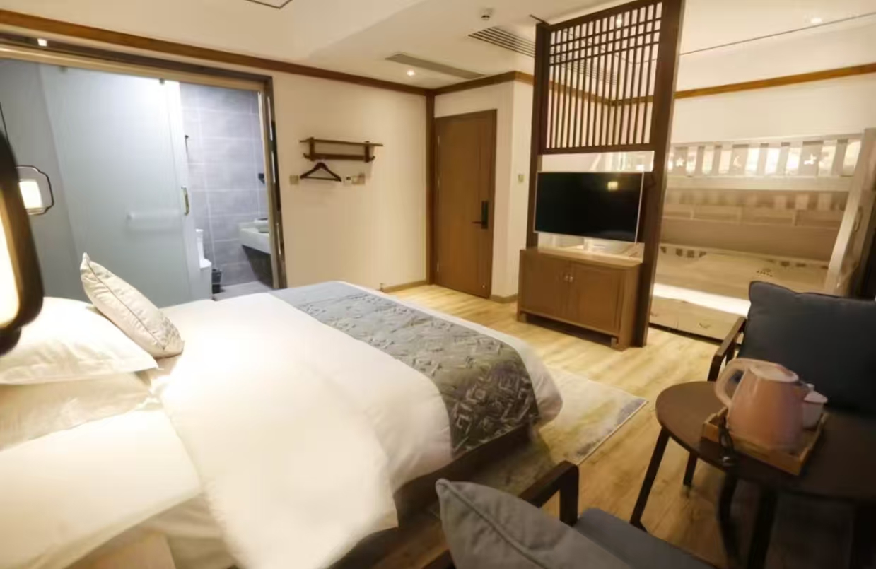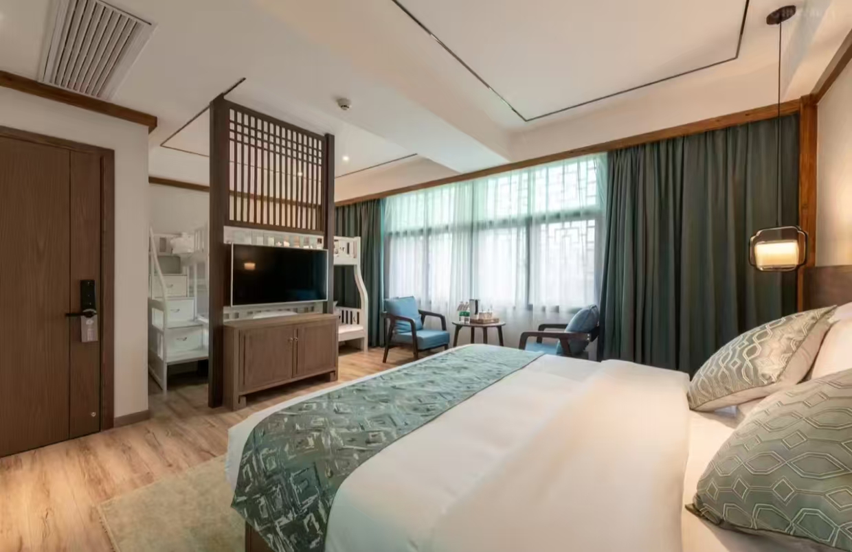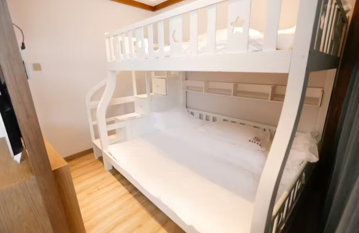 温馨豪华亲子房1张大床(1.8米宽)和1张上下铺(1.2米宽) 加床费用:该房型不可加床 清洁服务 每日打扫、打扫工具需前台索要、洗衣机 洗浴用品 牙刷免费、牙膏免费、沐浴露、洗发水、护发素、香皂、浴帽免费、梳子免费、剃须刀 厨房用品 厨房、厨房用具、电饭煲、微波炉需前台索要、烤箱、调味品、餐具、厨房清洁用品 客房布局和家具 沙发、衣柜/衣橱、书桌、休闲椅、餐桌、用餐区、挂墙装饰画/字画 网络与通讯 客房WIFI免费、客房有线宽带免费 食品饮品 咖啡壶/茶壶、茶包、电热水壶 卫浴设施 浴缸或淋浴、私人浴室、私人卫生间、吹风机、浴室化妆放大镜、毛巾、浴巾、24小时热水、拖鞋免费 室外景观 山景 客房设施 空调免费、手动窗帘、遮光窗帘、地毯、床具:鸭绒被、床具:毯子或被子、备用床具免费 媒体科技 电视机、智能门锁 便利设施 管家服务、衣架、单一规格电源插座、多种规格电源插座、220V电压插座 儿童政策 该房型欢迎携带儿童入住 婴儿床及加床政策该房型不提供加床、不提供加婴儿床