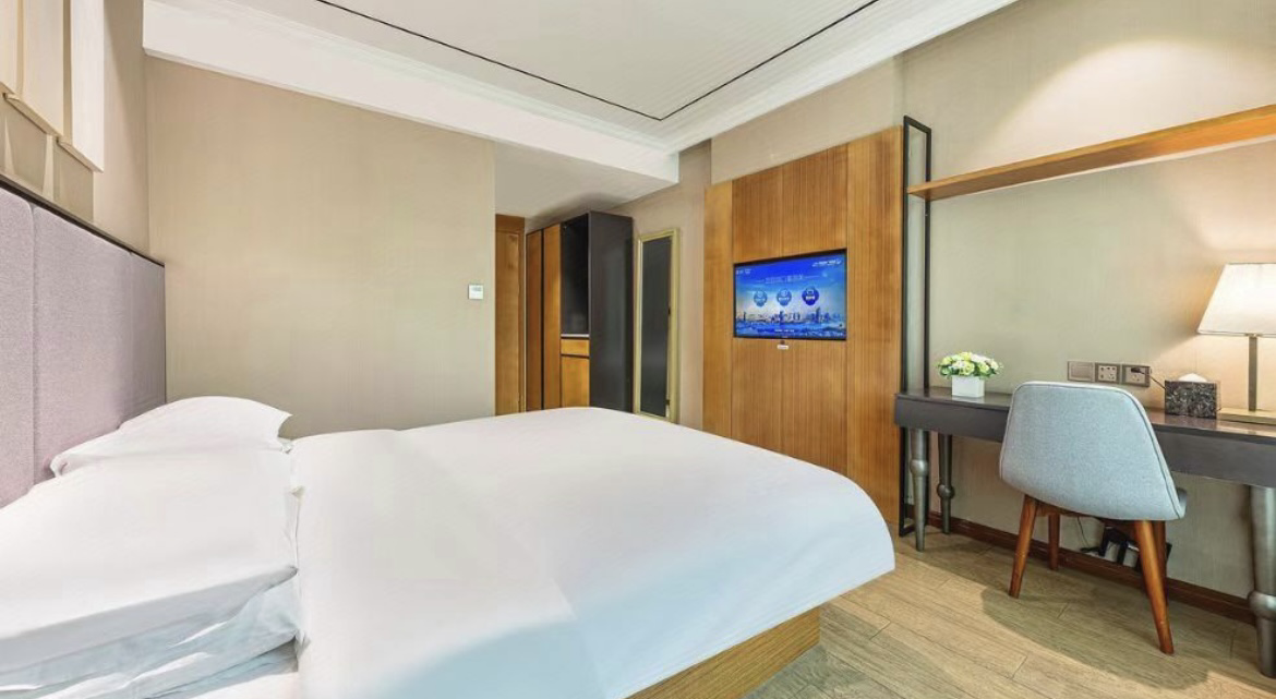 • 睡眠系统:配备1.8m×2.0m亲肤防螨大床,搭配高弹静音床垫与星级纯棉床品,确保深度睡眠体验。 • 卫浴空间:独立干湿分离卫浴,提供恒温淋浴系统、品牌洗护套装及一次性洗漱用品,兼顾洁净与便捷。 • 基础设施:43英寸高清智能电视、高速WiFi、独立空调、迷你冰箱、书桌及人体工学座椅,满足休憩与轻办公需求。 媒体科技