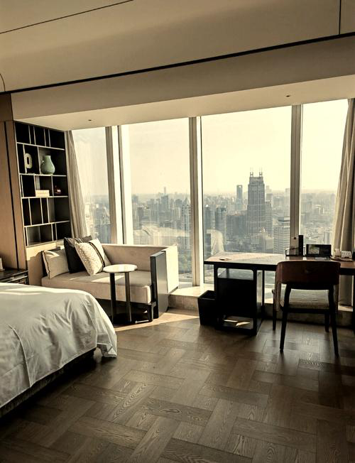 豪华海景房面积约60平方米,位于54层以上,配备全景落地窗可直瞰鼓浪屿,房间内提供