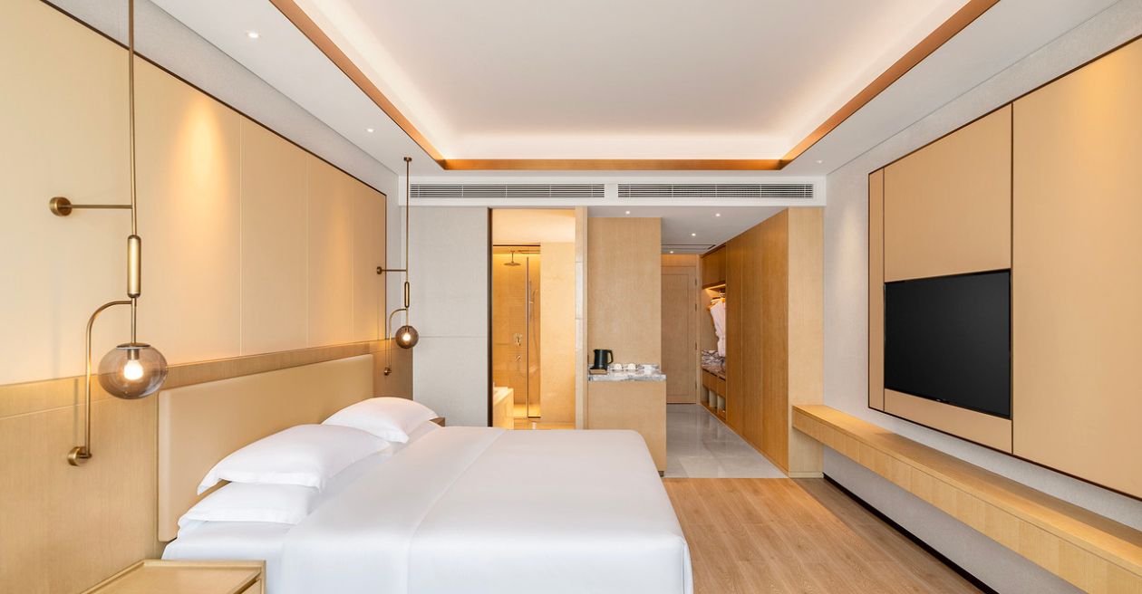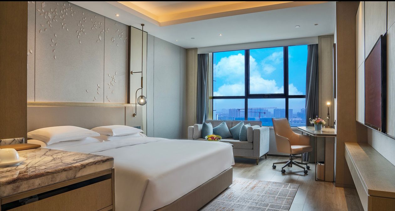 2.客房情况 :拥有三百余间客房及套房,房型包括高级房、豪华房、行政套房等,面积从40平方米到133平方米不等。房间设计摩登雅致,注重功能性和感官体验,有独立的工作区与休闲区,配备明亮落地窗、智能马桶等设施。