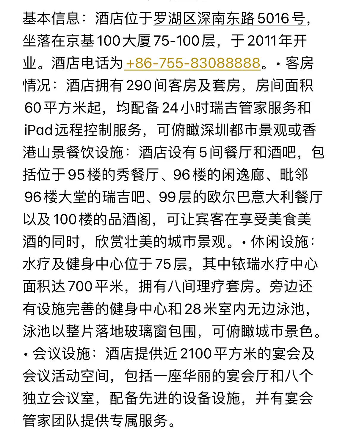 预约规则:需提前4小时预约 联系电话:+86-755-83088888 规则说明:深圳瑞吉酒店75楼水疗中心前台,使用地点:酒店 内,入住期间有效 接待时间:10:00-23:59 特别补充:1.预约规则:敬请提前四小时预约。 2. 联系电话:+86-755-83088888 3. 规则说明:领取方式为深圳瑞吉酒店75F水疗中心前台,入住期间每位在店客人可享受一次,且不可叠加使用。使用地点为75楼铱瑞水疗中心。 4.特别补充:仅限于SPA护理60分钟及以上项目。 不能购买产品;不可与店内其他优惠项目同时使用。 特别提醒:深圳瑞吉酒店75楼泳池,使用时需要佩 尊贵豪华城景双床房59平米 有窗 29层 |