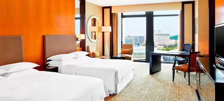 济南喜来登酒店,隶属于万豪国际酒店集团,傲立于济南的新东部商务区,毗邻济南市政府办公区龙奥大厦,倚窗而望,“东荷西柳”奥林匹克体育中心尽收眼底;远眺可观济南全新CBD,纵览济南新城澎湃。酒店拥有400多间舒适明亮、其中包括37间套房,每一间房间都彰显着喜来登制造的温暖与舒适,也融合着每一个喜来登人的心意。当夜幕降临的时候,在超大宽敞空间里,既可远眺奥体新建筑的现代美,又可遥望青山葱郁的自然美。在喜来登甜梦之床的温暖怀抱中进入甜美梦乡,尽情体验其柔软纤细所带来的极致享受。酒店设有健身中心、室内外泳池,让您享受到宾至如归的住宿体验。4个风格各异的风味餐厅及时尚酒廊,典雅中不乏浪漫,既能让您轻松的欢聚又可以进行庄重的商谈。超过3.500平方米的超大豪华宴会及会议场地,无论是举办大型会议,企业聚会或是浪漫婚礼,这里都将是您可选之地。在济南喜来登酒店发现完美旅行的力量。我们健身中心的室内外泳池也是您放松身心、焕发活力的理想之选。而我们卓越的炫逸水疗团队还将为您奉上各种个性化的按摩和全身护理服务。酒店共有 11 间多功能会议室,总面积超过3500 平米,可为您的会议就餐等重要活动带来无限灵感和发挥空间。无论是家庭喜宴还是商务会议,都会是您的满意之选。设施齐全的商务中心则可为您的商务活动提供强有力的技术支持。
