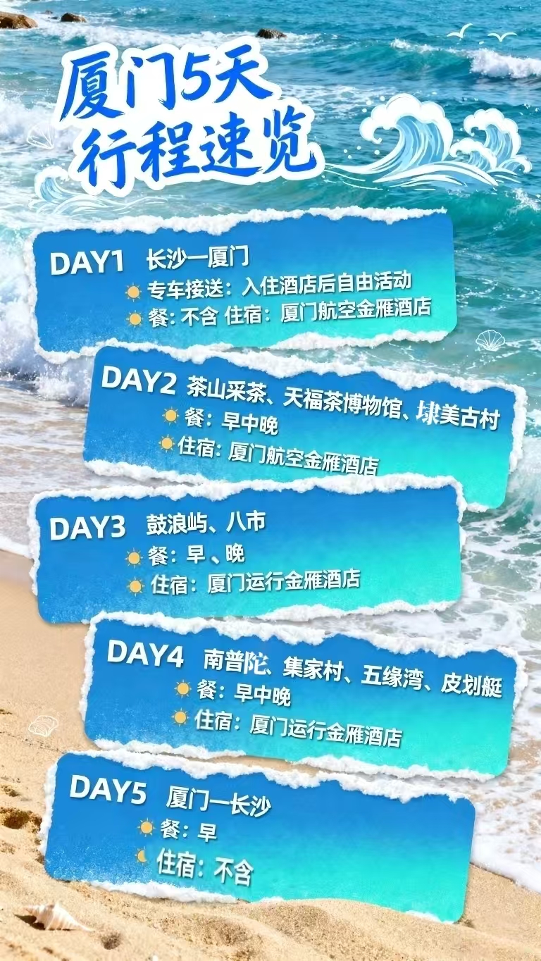 1、交通:长沙—厦门高铁二等座,当地空调旅游大巴,儿童报价不含高铁票