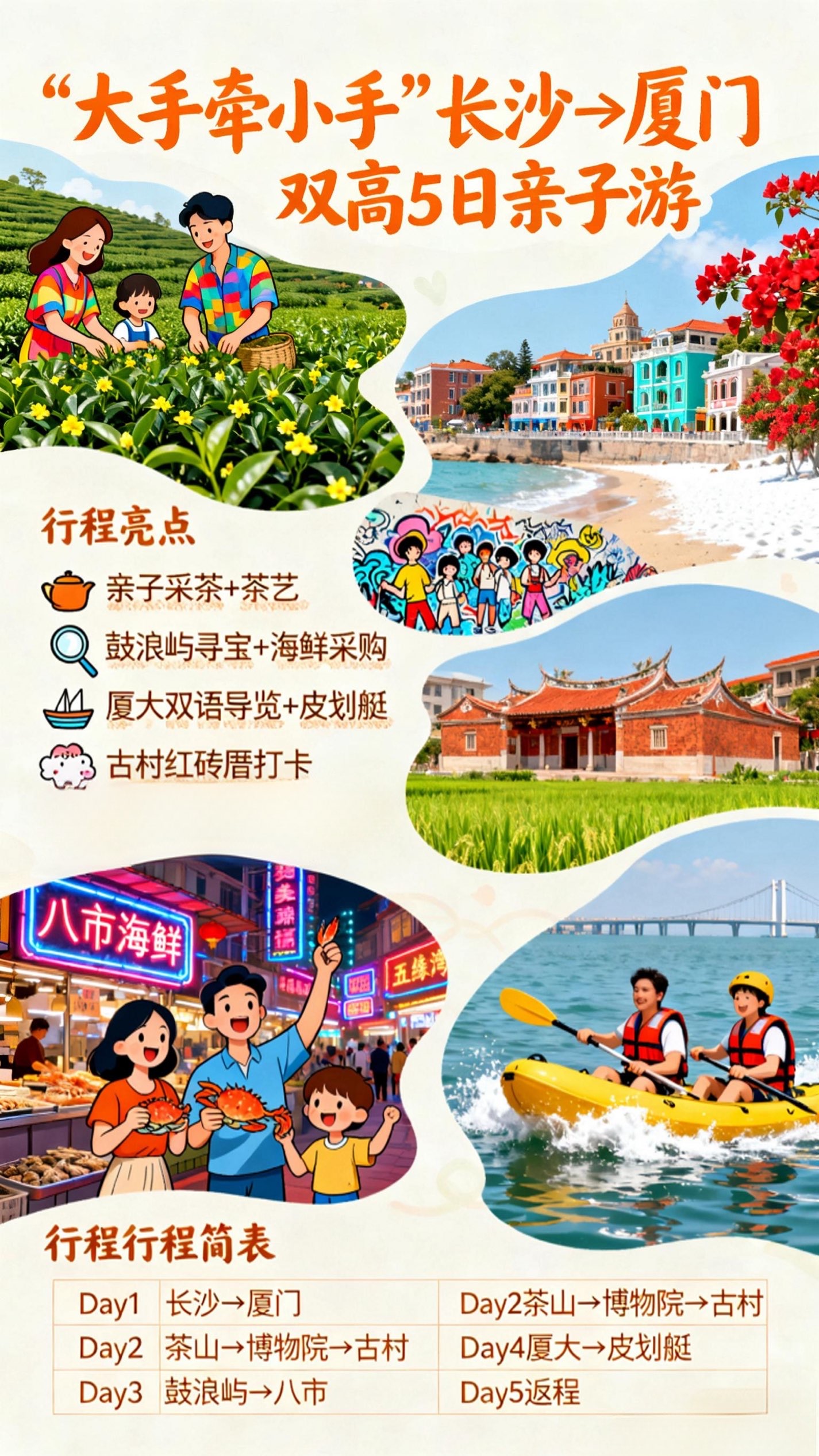 1. 亲子深度互动:全程设置丰富亲子活动,如亲子茶山采茶、观看中日韩三国茶艺表演、鼓浪屿寻宝、八市海鲜采购加工、厦门大学2人3脚游戏、五缘湾海上皮筏艇及沙滩足球/风筝赛/赶海等,主打“大手牵小手”的沉浸式亲子共游体验。