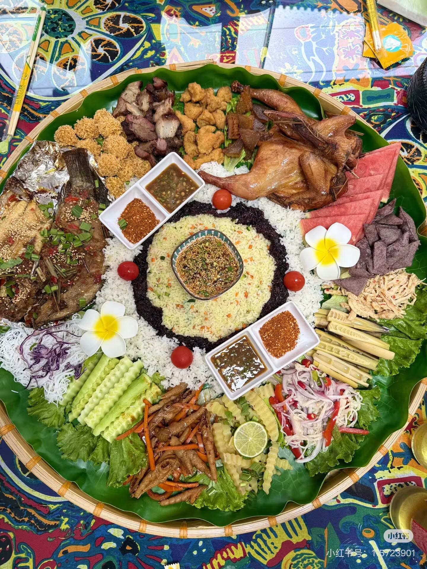 午餐我们特别安排傣味孔雀宴。何谓“孔雀宴”,孔雀宴就是过去傣族皇室接待贵宾的宴席,是傣家最具特色的宴席之一,它融合了傣族人民聪明、勤劳和爱美的特性。孔雀宴汇聚了傣家最具特色的佳肴美味,采集原生态新鲜食材用烤、炸、煎、炒、煮、凉、蒸、舂等傣家传统烹饪方法精心制作而成,摆放成孔雀开屏的形状,象征着幸福安康象征着吉祥如意。