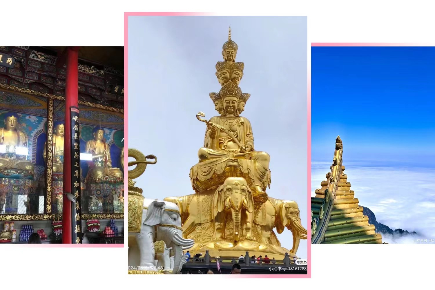 午餐后乘坐金顶往返索道(费用自理,往返120元/人)上金顶。峨眉金顶是以一尊48米高的十方普贤铜像为中心,由耀日的金殿、雄浑的铜殿、灼灼的银殿和洁白的朝圣大道组成的新金顶。金顶为峨眉山游程的最高峰,其海拔为3077米。在峨眉山金顶,还可能欣赏峨眉的四大奇景:日出、云海、佛光、圣灯。