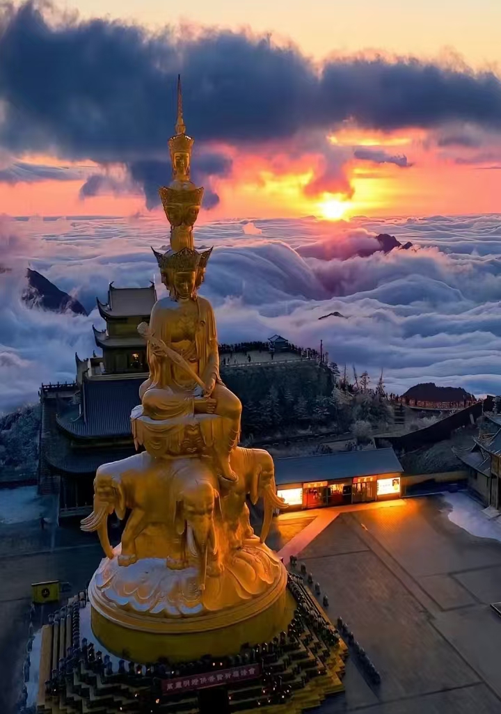 午餐后乘坐金顶往返索道(费用自理,往返120元/人)上金顶。峨眉金顶是以一尊48米高的十方普贤铜像为中心,由耀日的金殿、雄浑的铜殿、灼灼的银殿和洁白的朝圣大道组成的新金顶。金顶为峨眉山游程的最高峰,其海拔为3077米。在峨眉山金顶,还可能欣赏峨眉的四大奇景:日出、云海、佛光、圣灯。