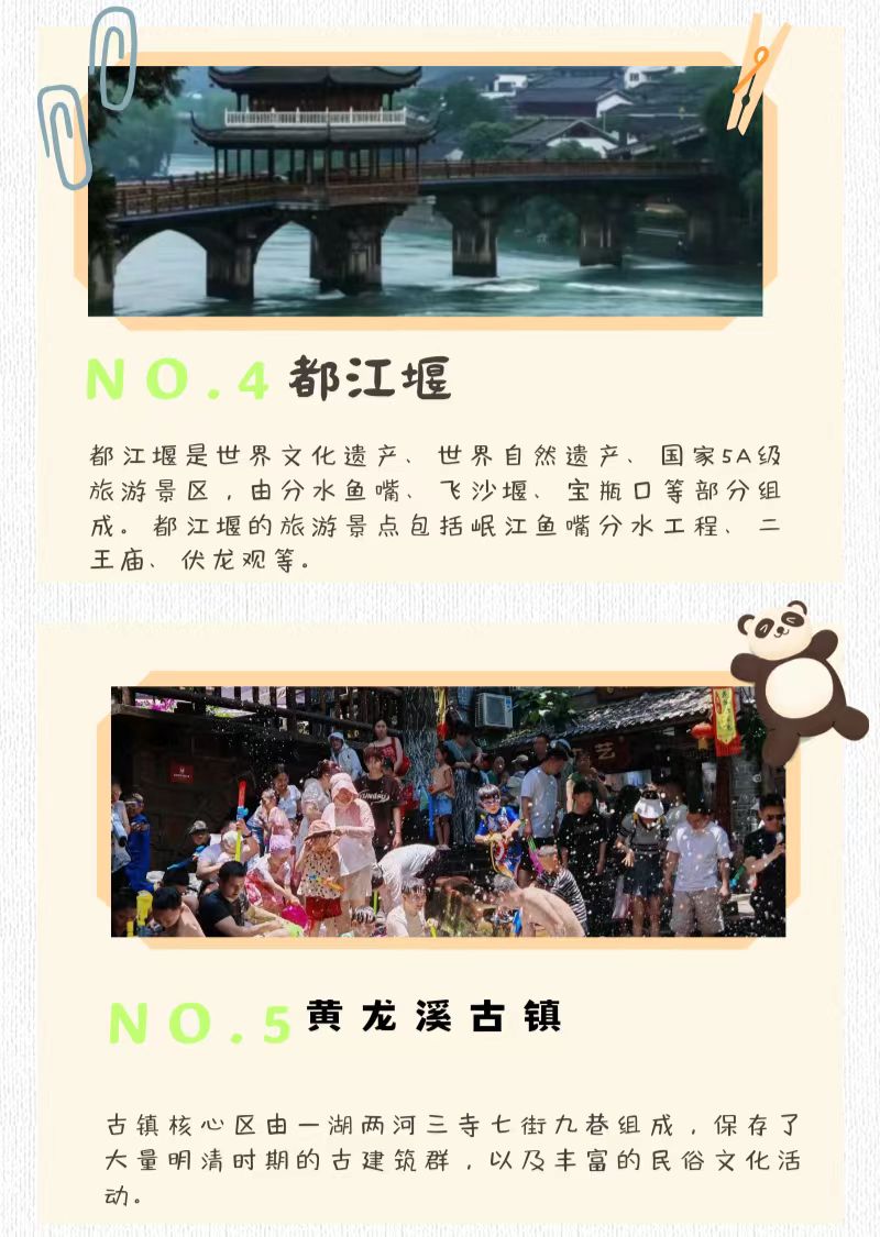 午餐后,游览都江堰水利工程(约2.5小时) 【都江堰水利工程】:都江堰于公元前256年由战国时期秦国蜀郡太守李冰率众修建,是全世界至今为止,年代最久、唯一留存、以无坝引水为特征的宏大水利工程,是世界水利文化的鼻祖。这项工程主要由鱼嘴分水堤、飞沙堰溢洪道、宝瓶口进水口三大部分和百丈堤、人字堤等附属工程构成,科学地解决了江水自动分流(鱼嘴分水堤四六分水)、自动排沙(鱼嘴分水堤二八分沙)、控制进水流量(宝瓶口与飞沙堰),两千多年来它一直发挥着防洪灌溉作用,使成都平原成为水旱从人、沃野千里的天府之国。都江堰旅游区为世界文化遗产、国家AAAAA级旅游景区、国家级风景名胜区。(景交自理:都江堰景区外电瓶车10元/人、都江堰景区内电瓶车15元/人,耳麦10元/人,玉垒阁扶梯40元/人。)